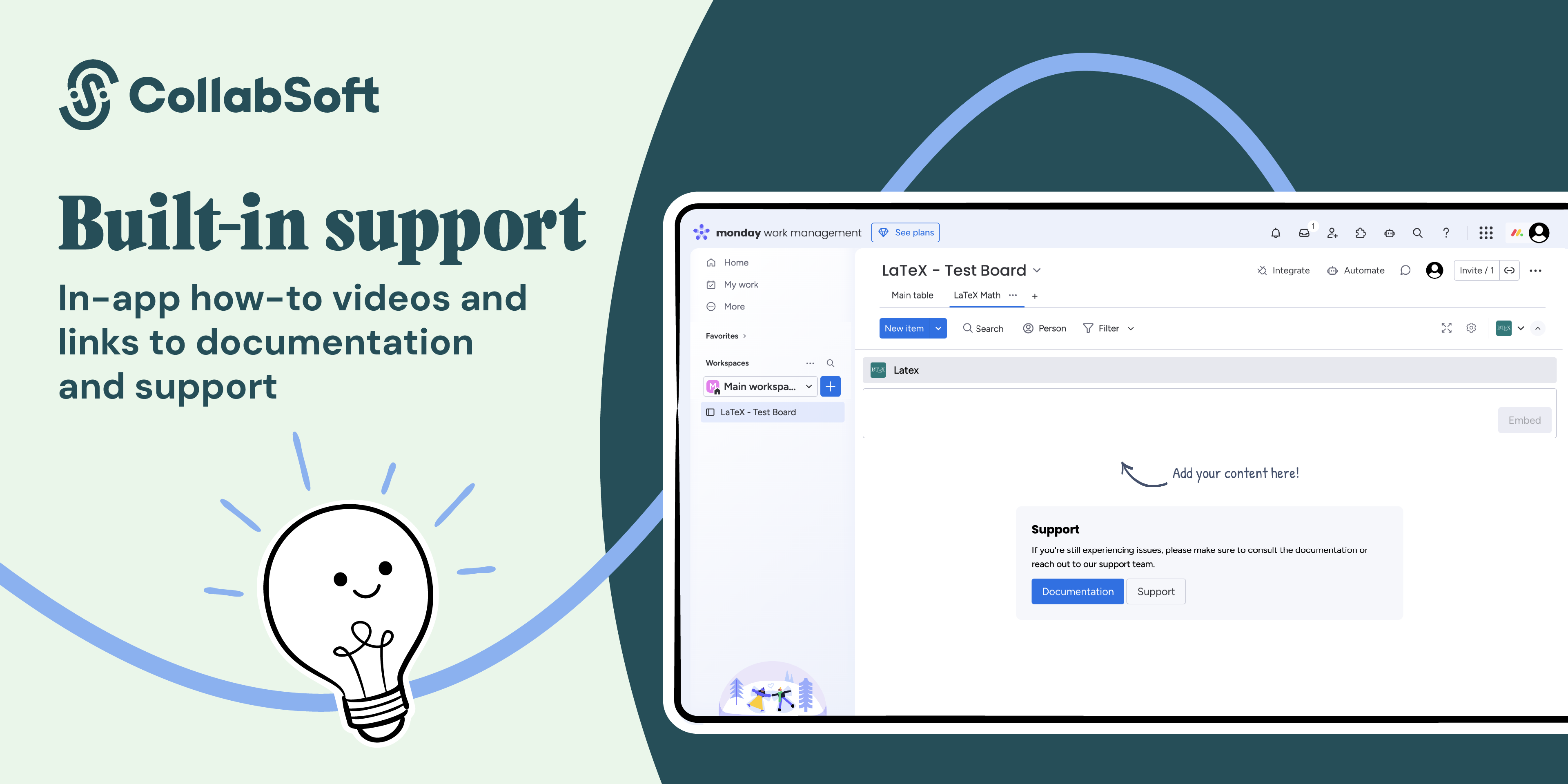 When you open the app in monday.com, how-to videos show you how to add a LaTeX block. You’ll also find links to our documentation and support portal if you need more help.
