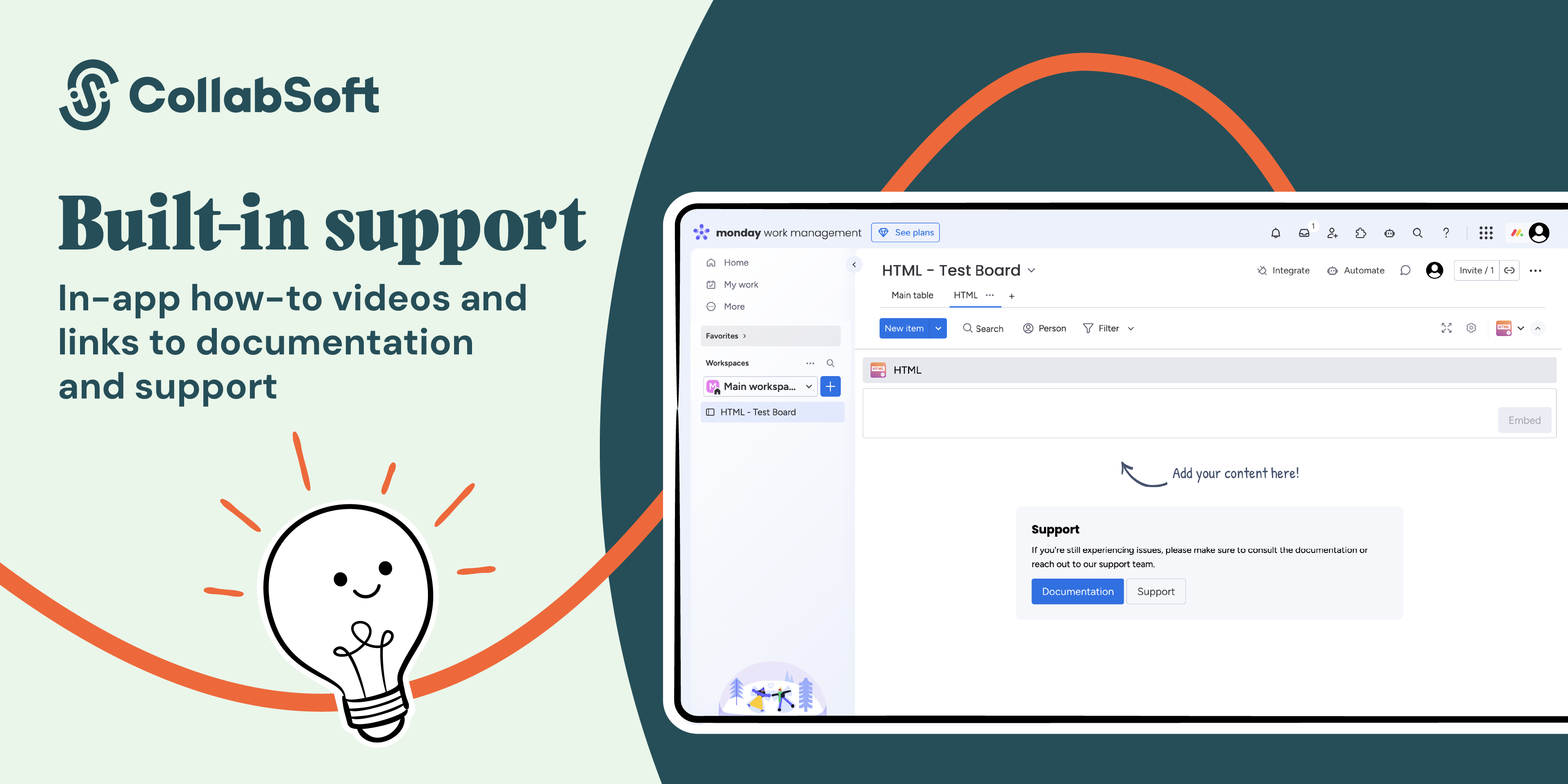 When you open the app in monday.com, how-to videos show you how to add a HTML dialog. You’ll also find links to our documentation and support portal if you need more help.