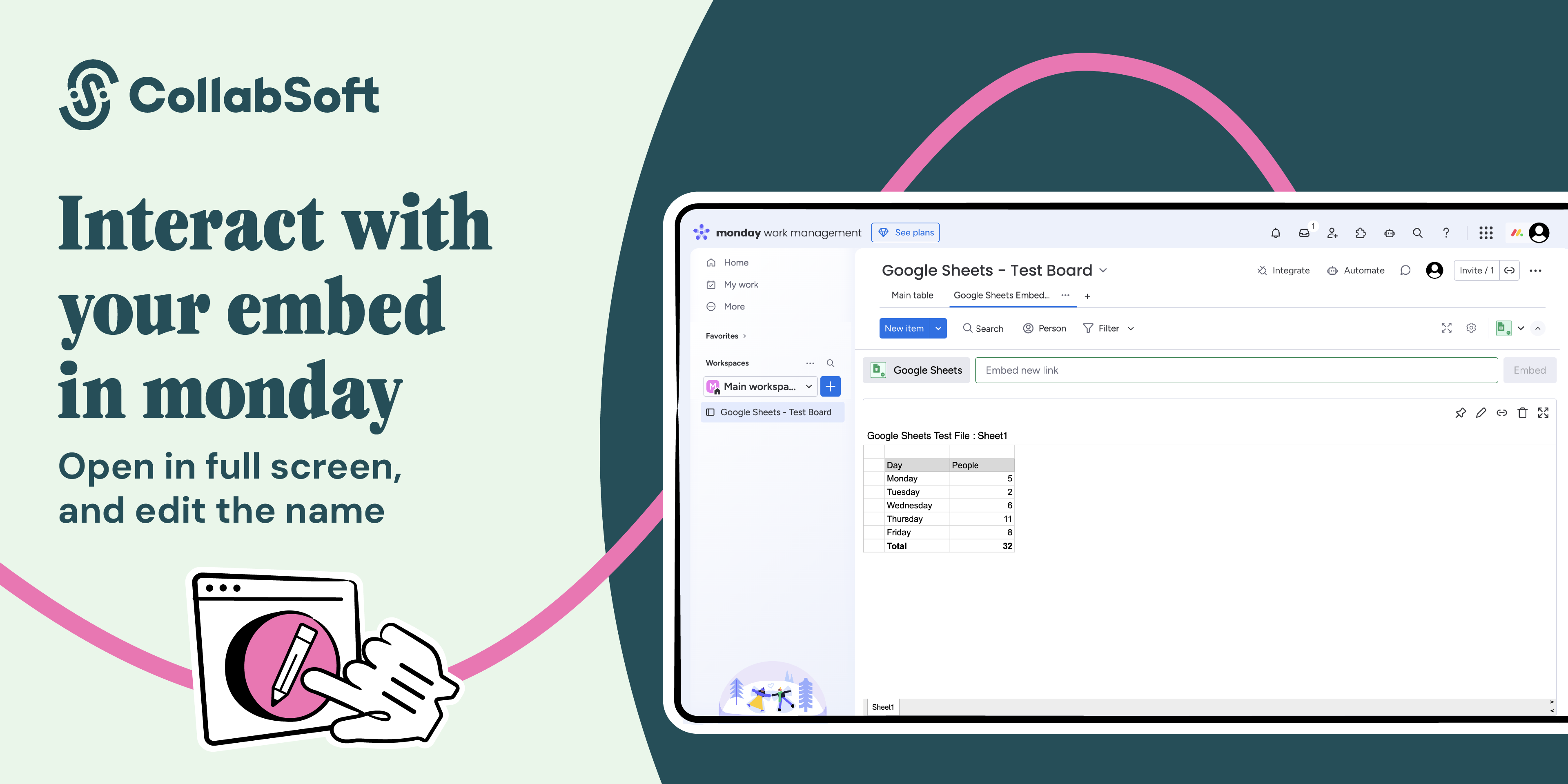 Display multiple Google Sheets in monday.com and pin the most important spreadsheet to the top of the view. You can also give each spreadsheet a name, and open your spreadsheet in full screen for more detail.