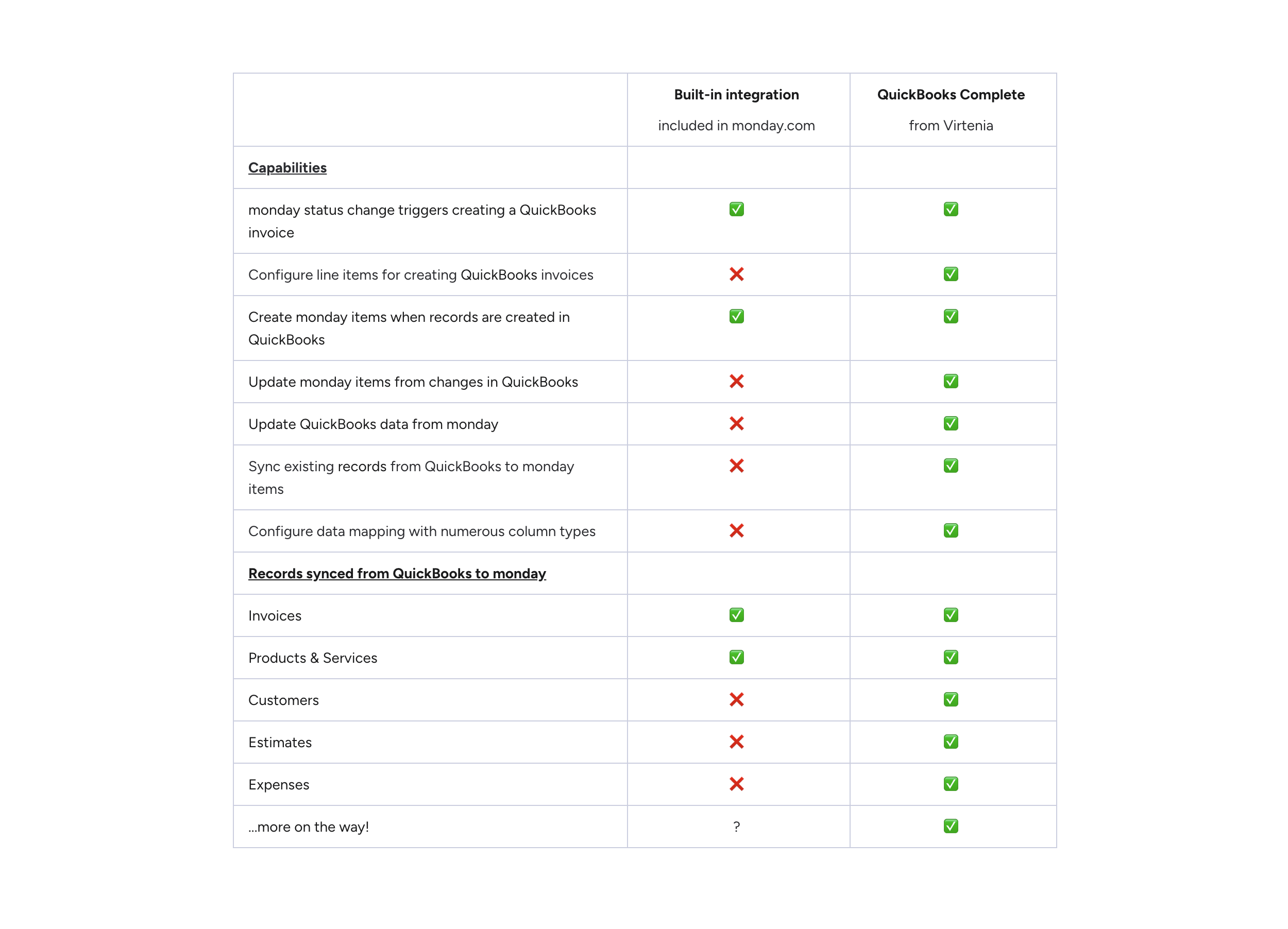 "description": "<p><strong>Proven integration for QuickBooks. Over 4000 installs, trusted since 2022.</strong></p><p><br></p><p>Virtenia Sync offers QuickBooks Complete Integration. Go <strong>beyond the built-in</strong> QuickBooks integration to work with your finances inside monday:</p><p><br></p><p>🛠️ <strong>Customers</strong></p><p>🛠️ <strong>Invoices</strong></p><p>🛠️ <strong>Estimates</strong></p><p>🛠️ <strong>Products and Services</strong></p><p>🛠️ <strong>Purchases</strong></p><p><br></p><p>🔄 Financial data is <strong>synced</strong> to monday boards, to use in your monday automations and workflow.</p><p><br></p><p>🚀 Payment status and other data become available to your monday users - <strong>including those without a QuickBooks</strong> login.</p><p><br></p><p>📝 <strong>Create and Edit QuickBooks data</strong> from monday.</p><p><br></p><p>⚙️ Create invoices from Automations - streamline business processes.</p><p><br></p><p>✅ <strong>Build dashboard widgets</strong> to tally financial data using monday's dashboard views.</p><p><br></p><p>💰 <strong>$ € ¥ £ ¥ International currency and tax support</strong></p><p><br></p><ul><li>Support any <strong>currency</strong> you select in QuickBooks</li><li><strong>VAT</strong> and Sales Tax support - works in US and other countries</li><li>True multi-currency (i.e. you send invoices in multiple currencies) coming soon</li></ul><p><br></p><p>🛠️ <strong>Connect to multiple QuickBooks companies</strong></p><p><br></p><p>☁️ Works with QuickBooks Online - not QuickBooks Desktop.</p><p><br></p><p>📺 Watch our<strong> </strong><a href=\"https://virtenia.com/integration-for-quickbooks/docs\" rel=\"noopener noreferrer\" target=\"_blank\"><strong>demo video</strong></a> to see it in action, right now.</p><p><br></p><p>📞 Or <a href=\"http://virtenia.com/sales-cal\" rel=\"noopener noreferrer\" target=\"_blank\"><strong>schedule a live demo + discussion</strong></a> - we're eager to understand your needs.</p><p><br></p><p>📈 In <strong>active development</strong> - reach out at our <a href=\"https://virtenia.com/support\" rel=\"noopener noreferrer\" target=\"_blank\">support page</a> with feature requests, or review our <a href=\"https://virtenia.com/sync/changes\" rel=\"noopener noreferrer\" target=\"_blank\">history of changes</a>.</p>",