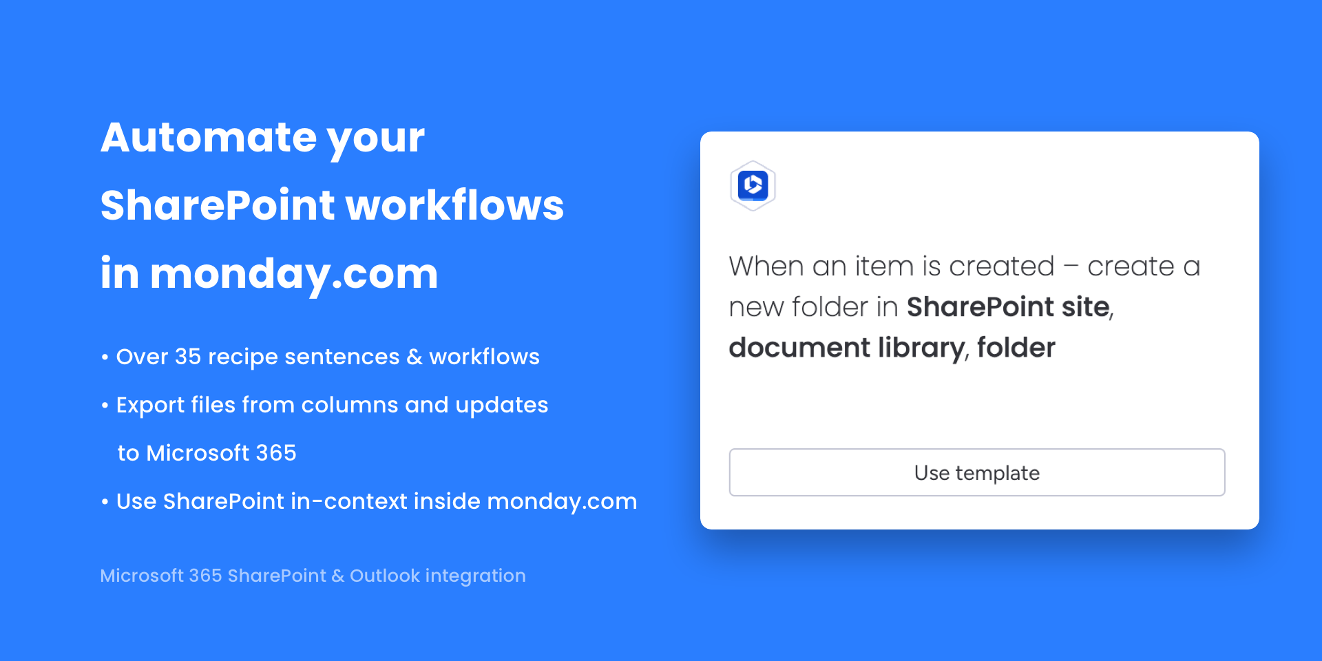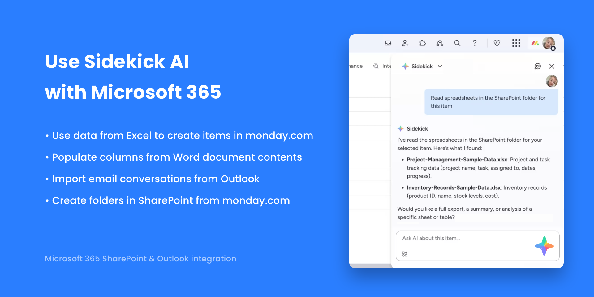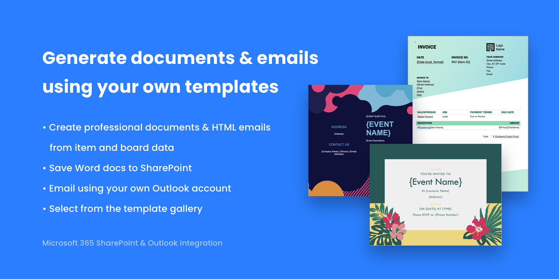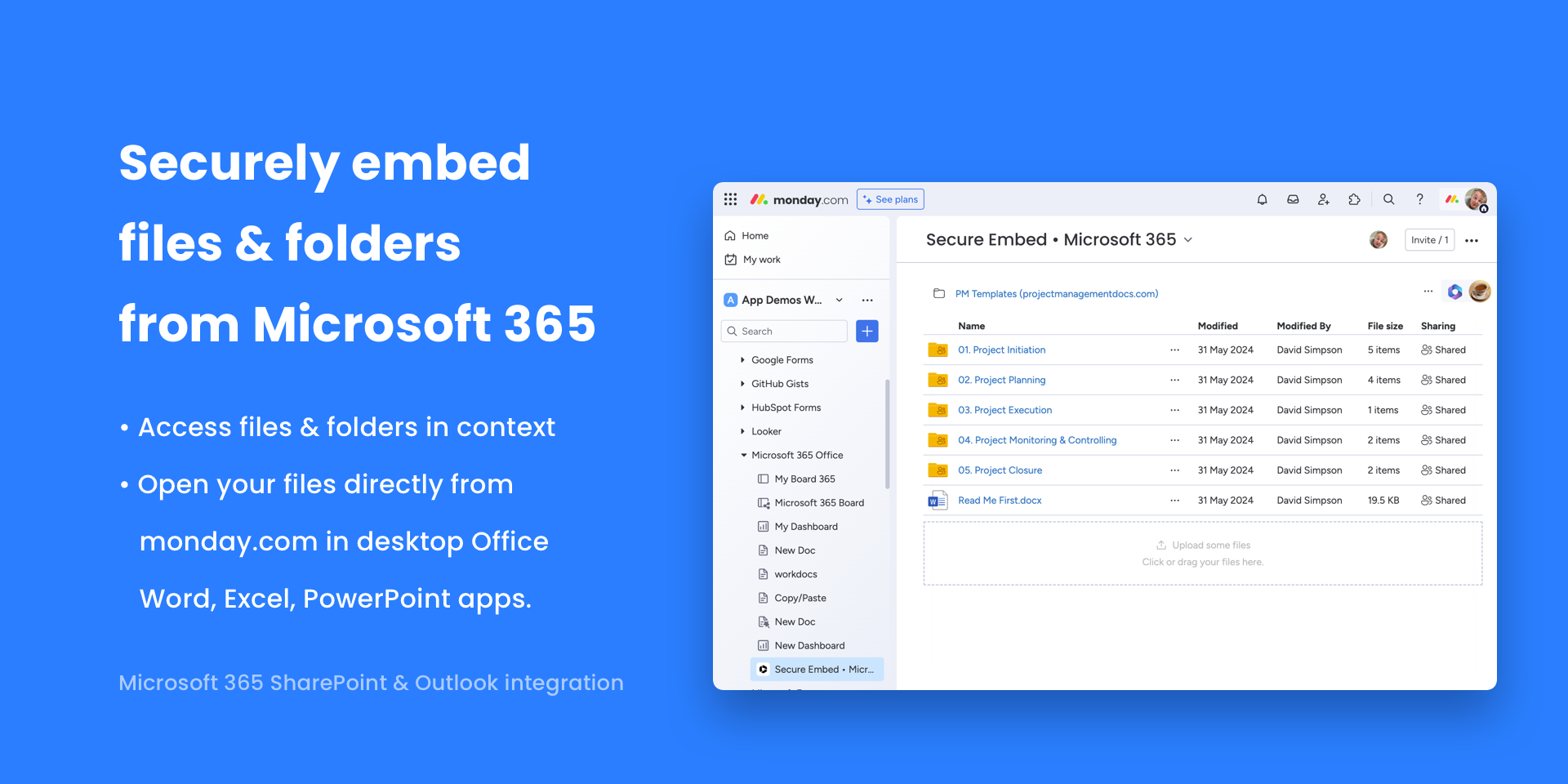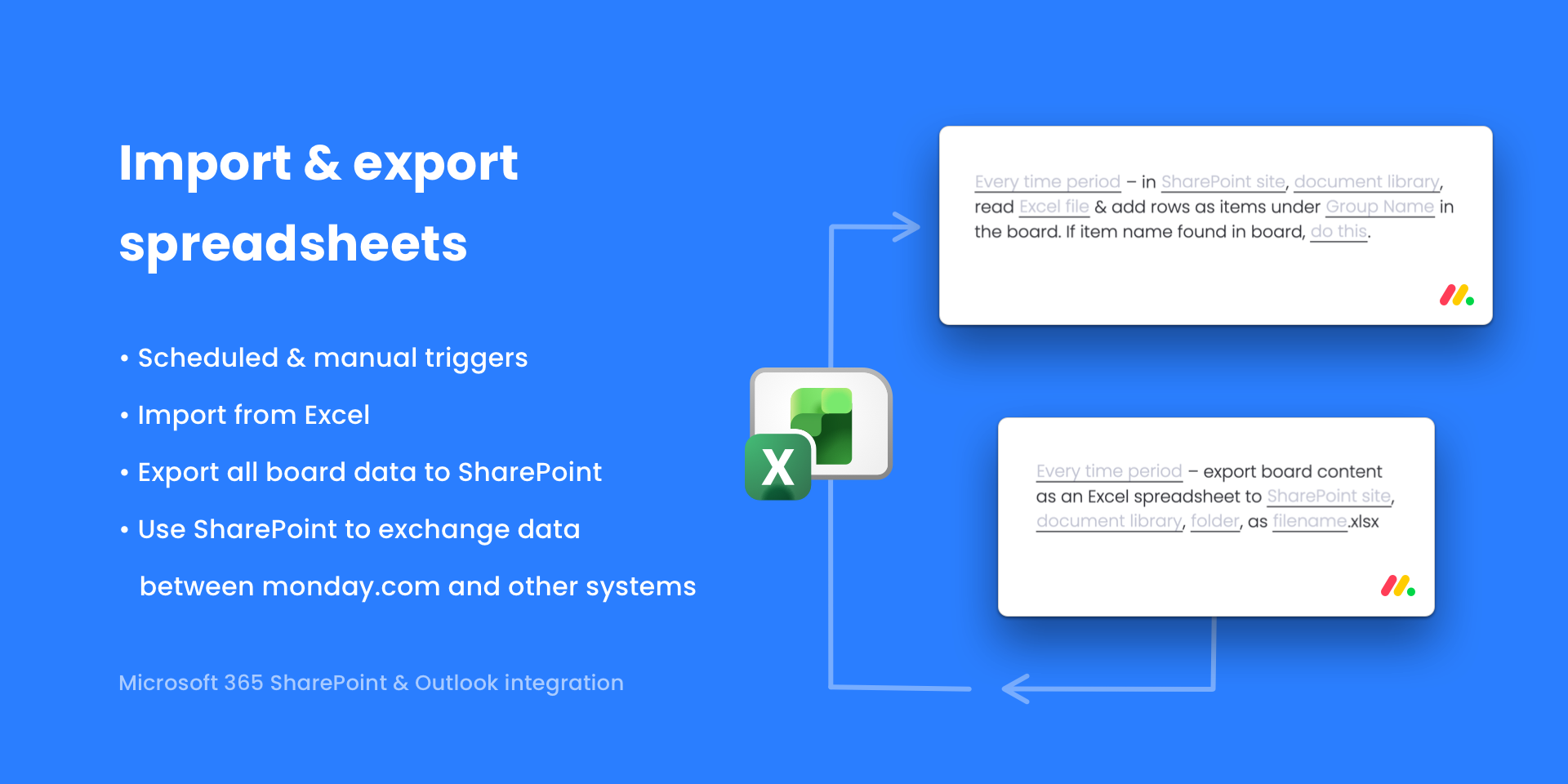 Securely manage & embed Microsoft 365, SharePoint & OneDrive files. Sync events with Outlook Calendar. Generate HTML emails, Word docs & PDFs from monday.com data. Import & Export Excel files saved in SharePoint.
