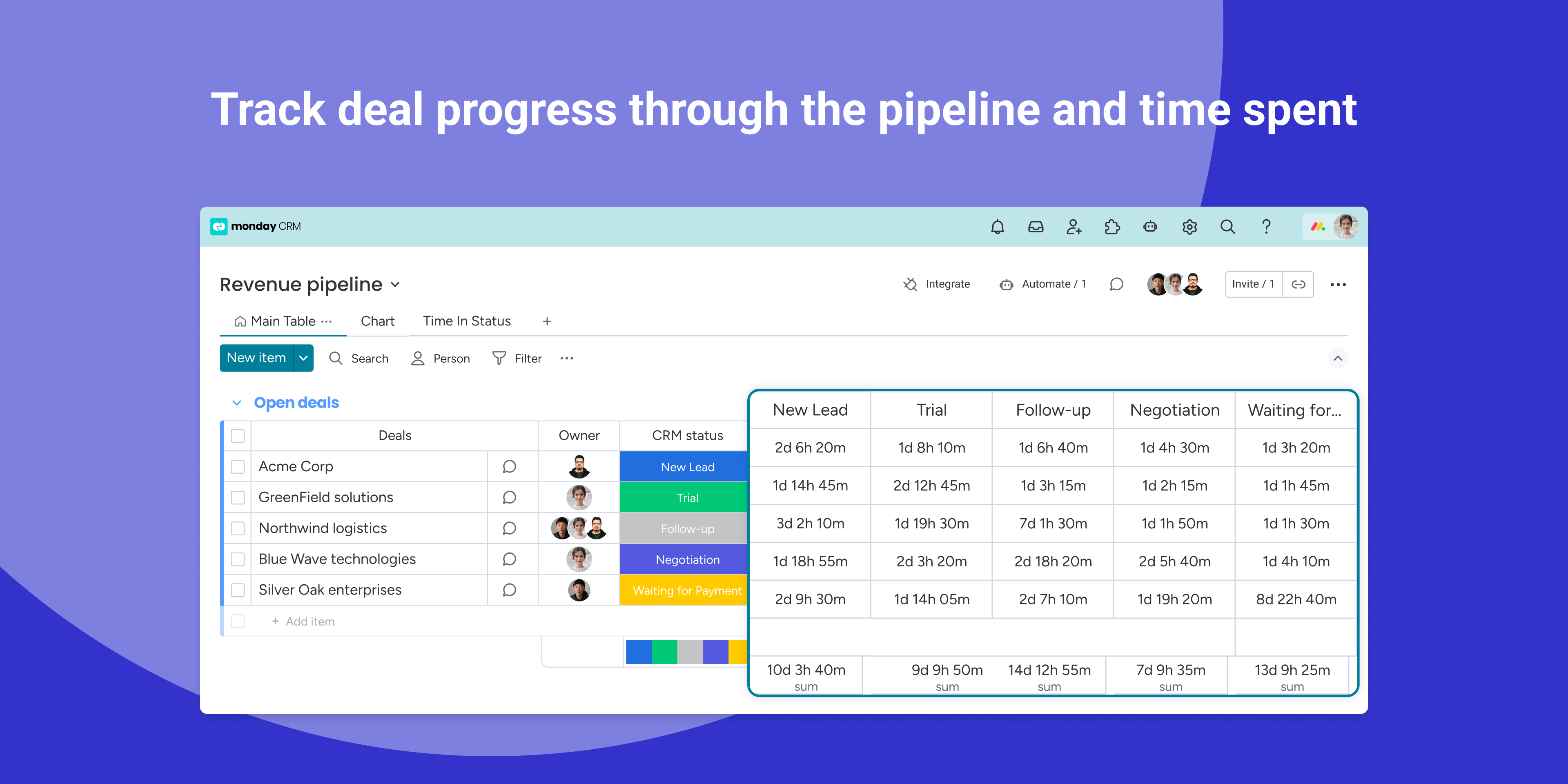Monitor progress and time spent on tasks, deals, or projects