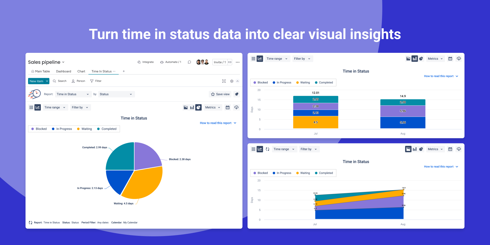 Whether it’s sales pipelines in CRM or operational workflows in Work Management, the solution is the same: Time in Status for monday.com shows how long work stays in each stage, to identify weak points and improve performance.