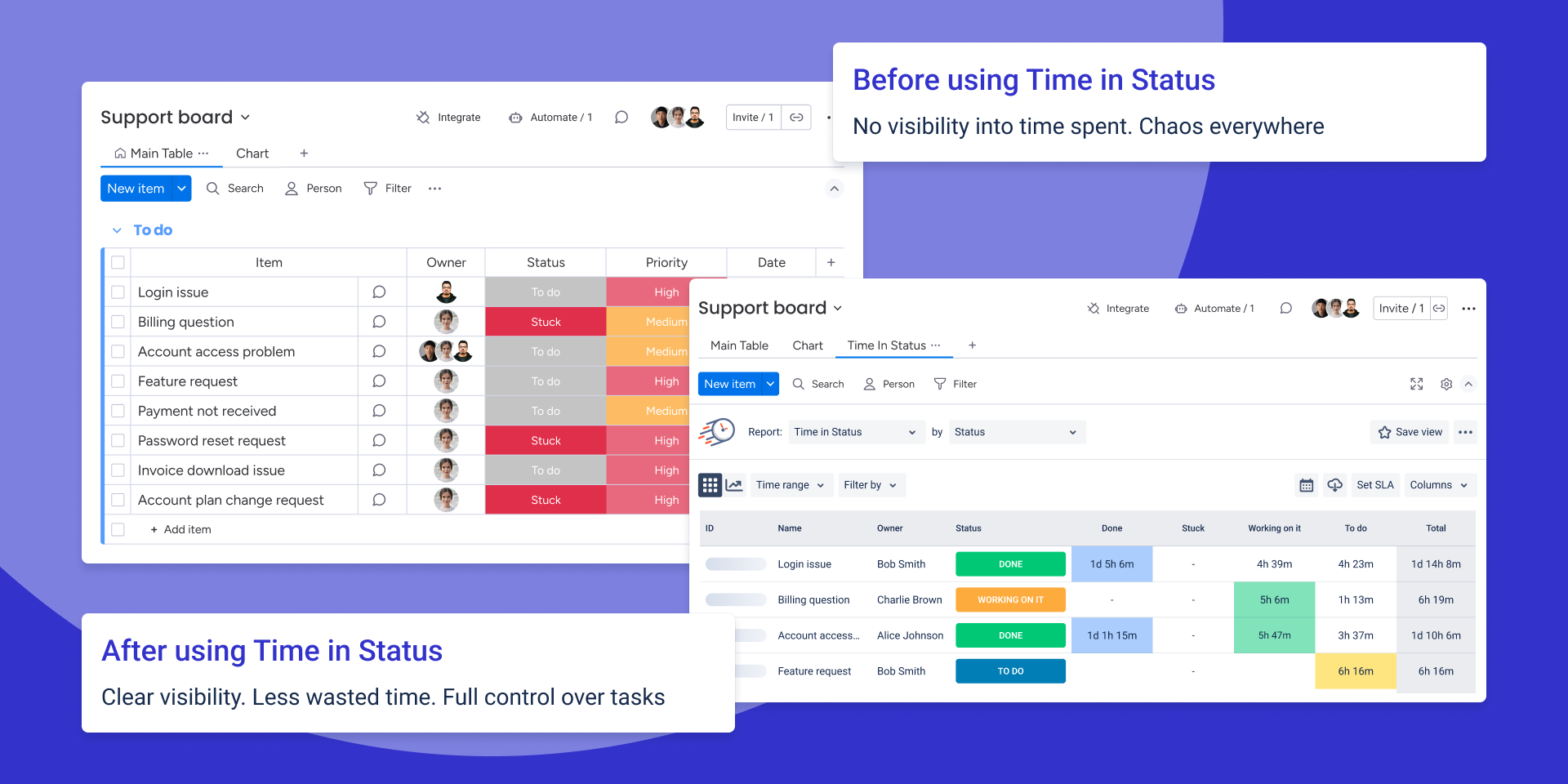 Use charts and reports to instantly spot slow stages and bottlenecks by item, assignee, team, or status.