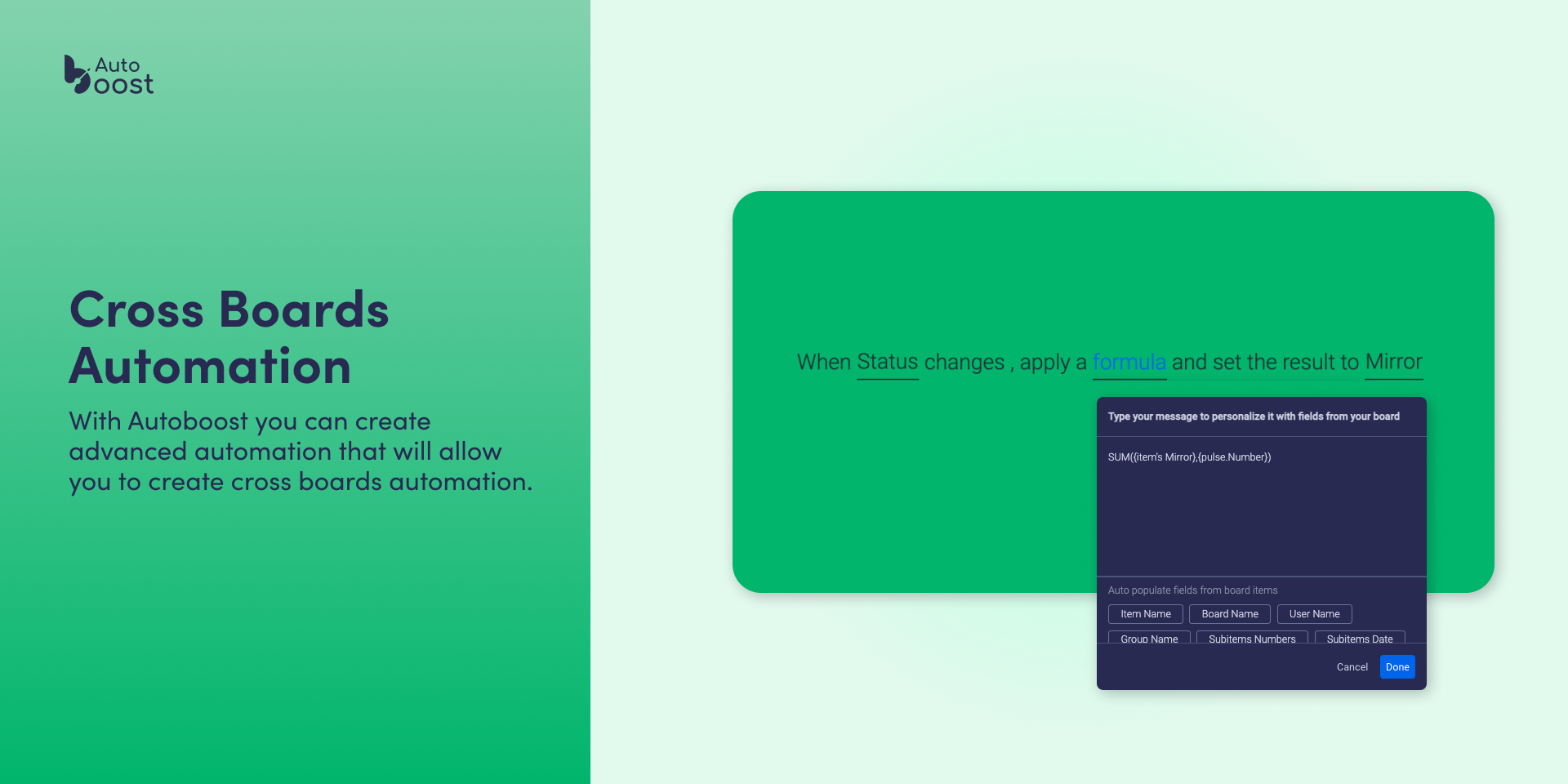 With Autoboost, you can keep your boards perfectly aligned. Automatically connect related items, sync values in real time, and trigger actions across boards - no manual work required. Manage projects, clients, or team tasks with confidence - Autoboost keeps your data consistent, connected, and always up to date