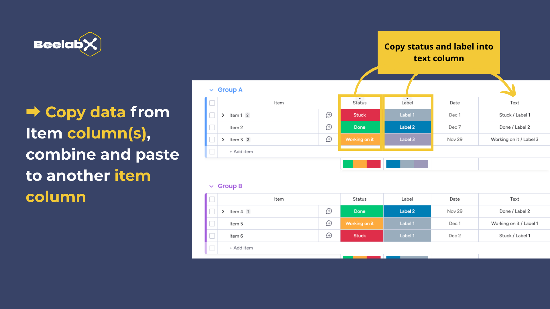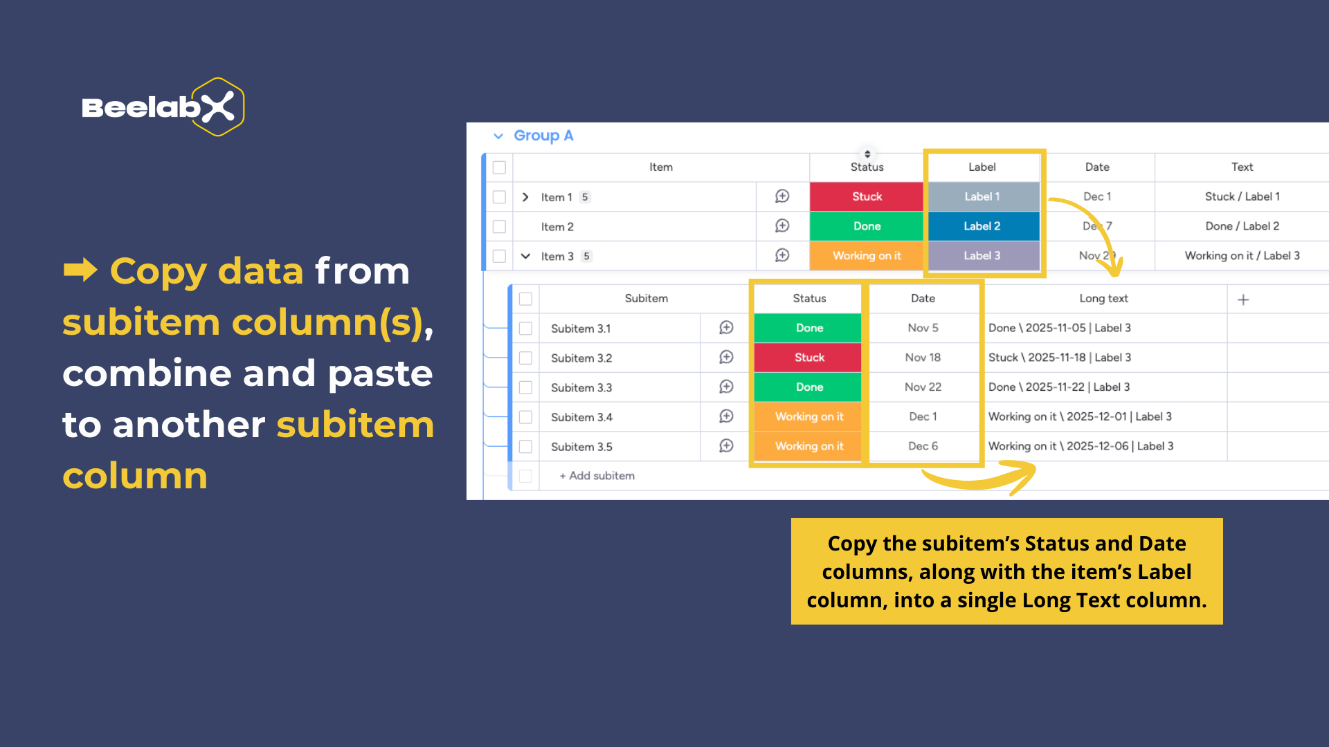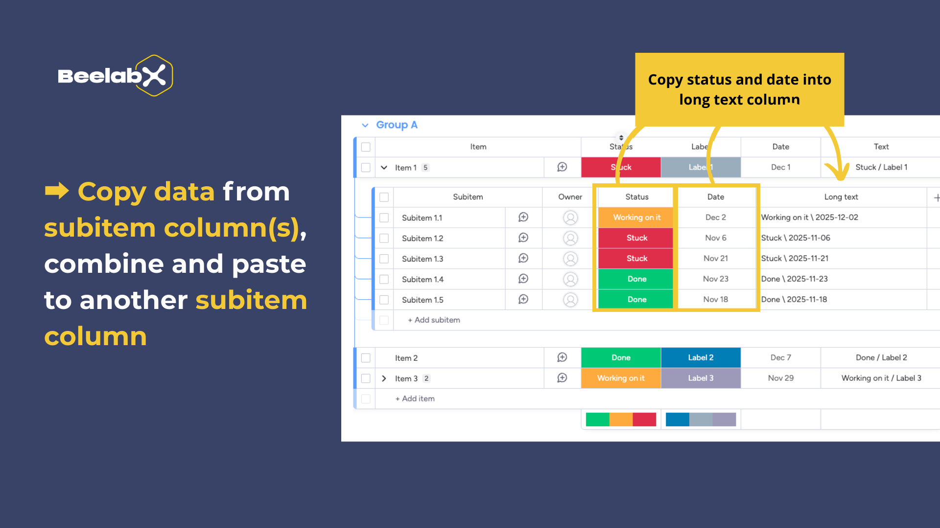 Copy Paste Master lets you copy data from one or different column(s) of an item or subitem, combine it with your defined format and paste it into another column.