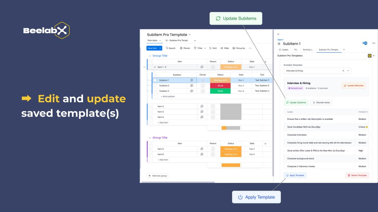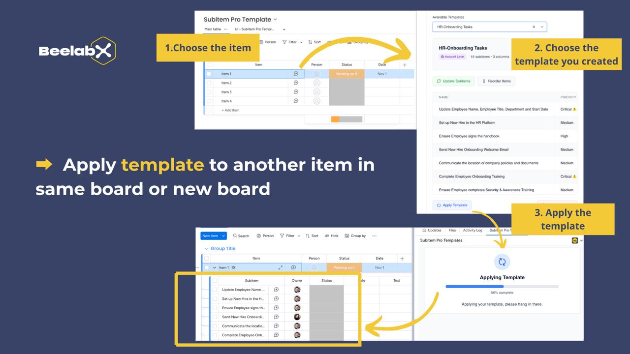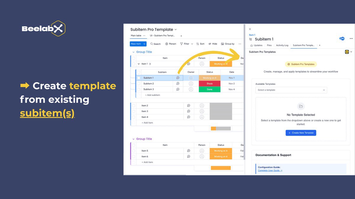With Subitems Pro Templates, save a list of tasks with their properties and deploy them as subitems of any item located on any of your board.