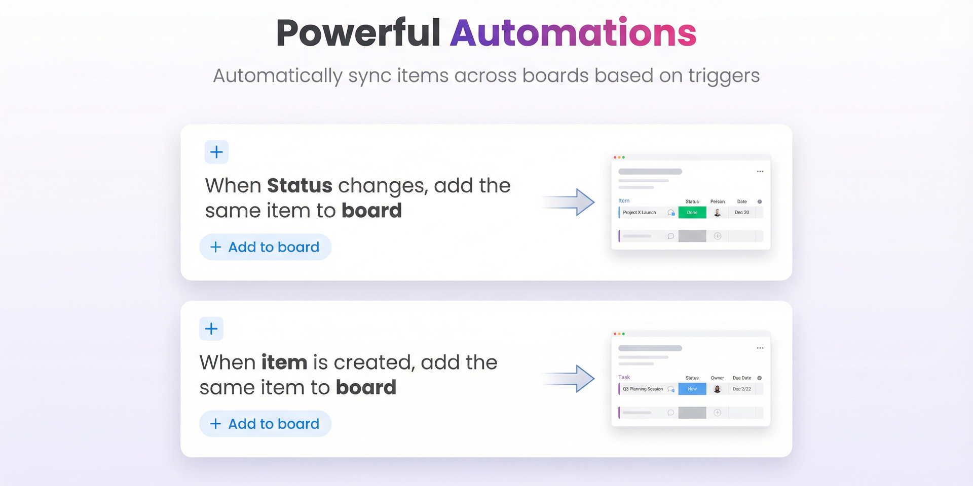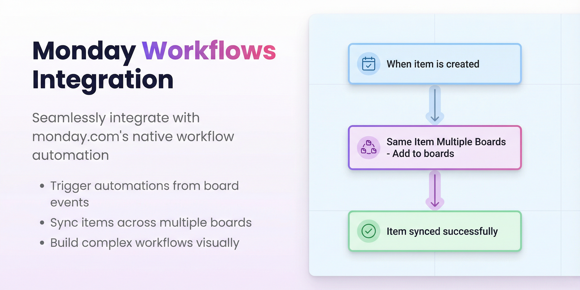 100% native to monday's platform</p><p><br></p><p>If youโre using <strong>monday.com</strong>, youโve probably run into this:</p><p>You want the <em>same item</em> to appear in multiple boards โ maybe one for each team, project, or client โ but... ๐ต</p><p>You end up duplicating the item, mirroring columns, setting up messy automations, or losing data altogether.</p><p><strong>Same Item Multiple Boards </strong>is your elegant fix. It lets you <strong>share and sync a single item across multiple boards</strong>, so updates, columns, subitems โ even replies โ stay perfectly in sync.</p><p><br></p><p><strong><u>Features</u></strong></p><p><br></p><p>๐ฅ <strong>One item. Multiple boards - </strong>Create items that live on multiple boards.</p><p>๐ฅ <strong>Sync updates & subitems - </strong>Comments, updates, and even subitems are reflected across all shared boards in real time.</p><p>๐ฅ <strong>Choose what to share.</strong> Only want to sync certain columns? Avoid subitems syncing? Youโre in control.</p><p>๐ฅ <strong>Post updates from anywhere.</strong> Keep conversations centralized even when team members are on different boards.</p><p>๐ฅ <strong>Automations & workflows.</strong> Set up cross-board automations, connect items to subitems, and build scalable systems without breaking a sweat.</p><p>๐ฅ <strong>Build master boards.</strong> Aggregate tasks from different boards into one clean overview board โ no custom automation gymnastics required.</p><p><br></p><p><strong><u>Who itโs for</u></strong></p><p><br></p><ul><li>Agencies juggling multiple client boards</li><li>Teams managing the same work across departments</li><li>Project managers building cross-board workflows</li><li>Businesses in healthcare or other regulated industries</li><li>Anyone who wants to <strong>automate smarter</strong> and <strong>work cleaner</strong></li></ul><p><br></p><p><strong><u>Got Questions? Weโve Got You Covered</u></strong></p><p><br></p><p>๐