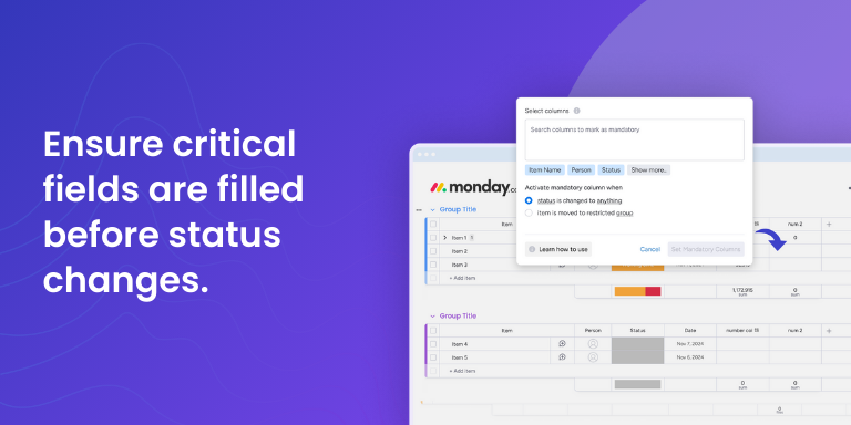 Managing incomplete data can be time-consuming and prone to human error. With MandatoryFields Smart Column, part of the Smart Columns Suite, you can ensure that all required fields are filled out before items can progress, guaranteeing data accuracy and compliance across your monday.com boards.