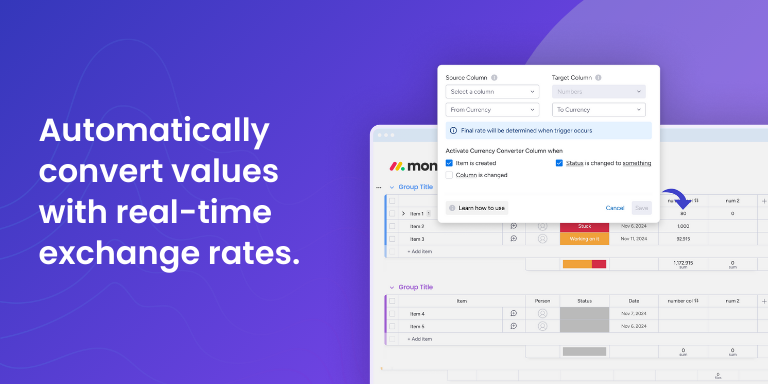 Simplify your financial data management with Currency Converter Smart Column, part of the Smart Columns Suite. Effortlessly convert any currency directly within your boards into any number or text column, ensuring real-time accuracy with up-to-date exchange rates. Whether you're managing international transactions or working across multiple currencies, this app helps you save time and reduce errors, allowing you to focus on more critical tasks.