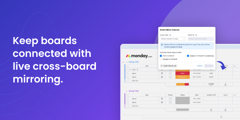 Real-Time Data Sync: Automatically sync data between Mirror and Standard columns, ensuring that updates on one board are instantly reflected on another.