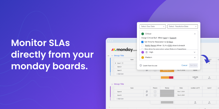 "description": "<p><strong>What Smart SLA Status Column Does:</strong></p><p>Keep your team on track with SLAs and deliver exceptional service using the <strong>Smart SLA Status Column</strong>. This powerful app integrates seamlessly with your monday.com boards, allowing you to set SLA tracking directly in a standard status column. With real-time monitoring and proactive alerts, Smart SLA Status Column ensures you stay ahead of commitments and prevent breaches before they occur.</p><p><br></p><p><br></p><p><strong>Key Features of Smart SLA Status Column:</strong></p><ul><li><strong>Easy Configuration</strong>: Effortlessly set up SLA tracking within your existing boards. Simply configure SLA logic in the status column and get up and running in minutes.</li><li><strong>Real-Time SLA Tracking</strong>: Monitor service performance live and ensure SLAs are met by comparing actual service metrics against your commitments in real-time.</li><li><strong>Proactive Alerts</strong>: Get immediate notifications when an SLA is at risk, empowering your team to take action before any deadlines or agreements are breached.</li></ul><p><br></p><p><strong>About Smart Columns Suite:</strong></p><p>The <a href=\"https://jetpackapps.co/smart-columns/\" rel=\"noopener noreferrer\" target=\"_blank\"><strong>Smart Columns Suite</strong></a> is a collection of powerful apps designed to enhance your monday.com boards, turning everyday columns into smarter, more efficient tools. From managing data integrity to automating workflows, each app in the suite is crafted to address specific operational challenges, making your team’s work more seamless and productive.</p><p><br></p><p>With the <strong>Smart Columns Suite</strong>, you gain access to multiple apps that work together to solve complex problems, all while ensuring flexibility and ease of use. Best of all, when you purchase any app in the suite, you have the access to the <strong>entire suite </strong>— ensuring you have all the tools you need to optimize your workflow across the board and you are safe from the hassle of buying many independent apps.</p><p><br></p><p>To learn more<a href=\"https://guest.getresponse.chat/?c=9de079a759ca5a1629330d1f86505a086e89008391e5b3664dce375d67\" rel=\"noopener noreferrer\" target=\"_blank\"> Chat With Us</a>, <a href=\"https://calendar.app.google/86j14117GSV5enFZA\" rel=\"noopener noreferrer\" target=\"_blank\">Book a Meeting</a> or <a href=\"https://youtu.be/LGKLrDKJAfQ\" rel=\"noopener noreferrer\" target=\"_blank\">Watch a Demo</a></p>",