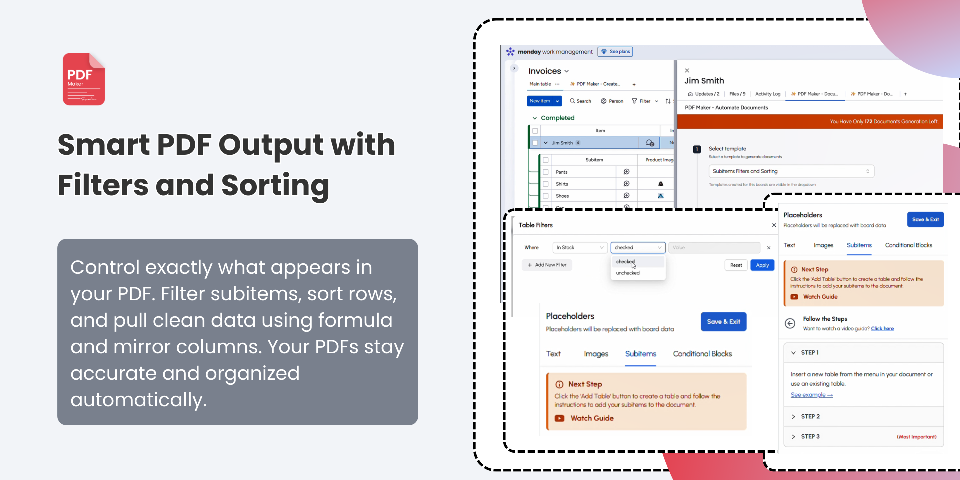 PDF Maker helps monday.com teams create documents and collect signatures without switching tools. You can turn any item, subitem, formula column, or mirrored field into a polished PDF and send it for signature in a few clicks.