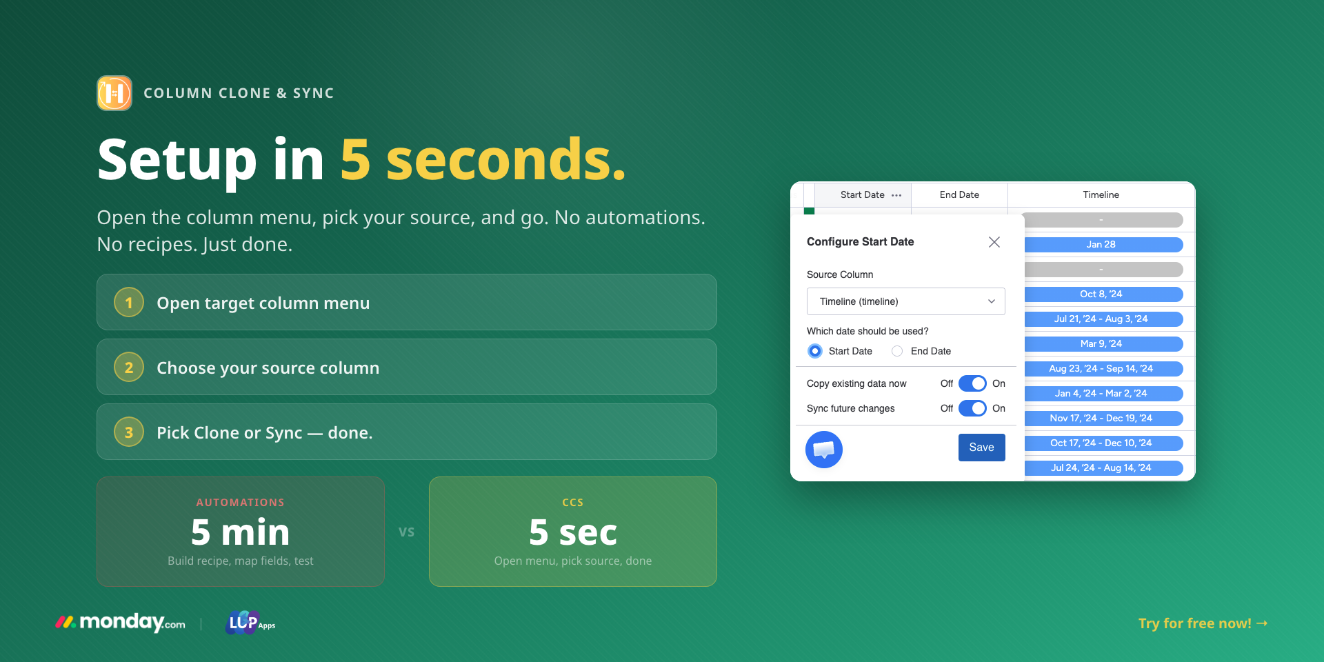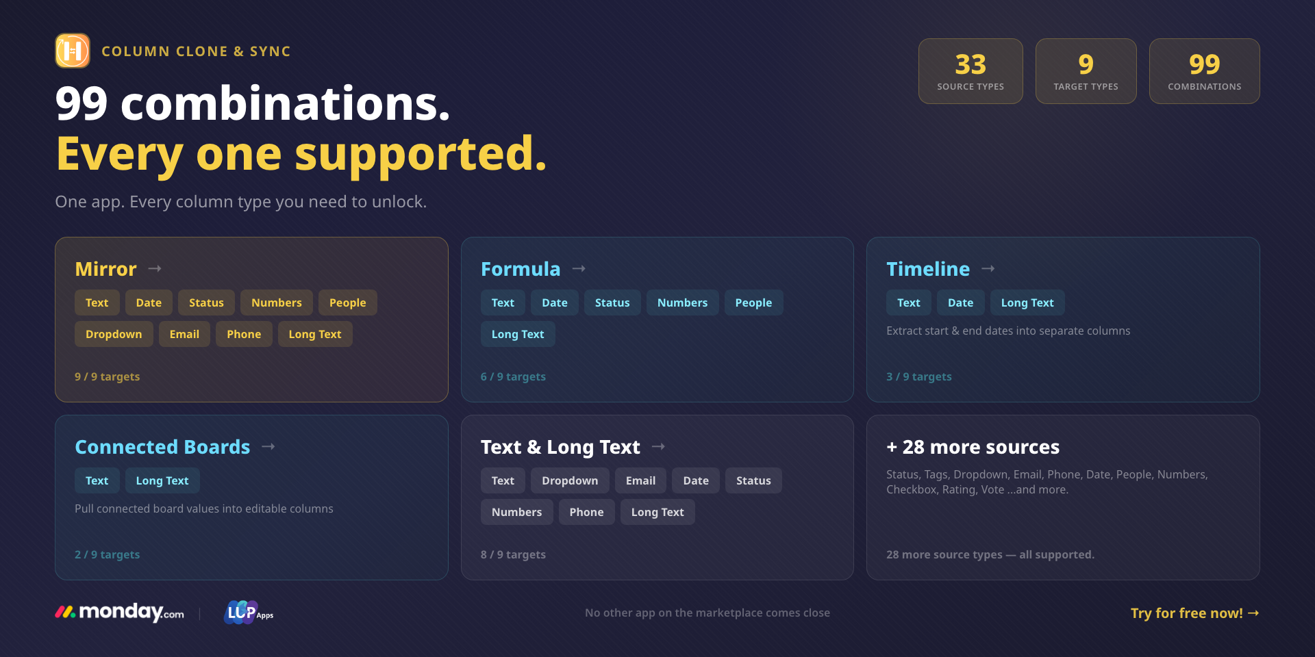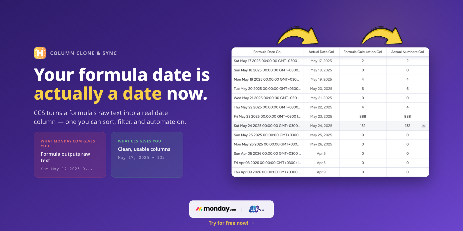 "description": "<p>You're building a workflow in monday.com and you <strong>hit a wall</strong>. </p><p>Column Clone & Sync lets you move data between any column types in monday.com - instantly.</p><p><br></p><p>Formula results that need to be in a date column? Done. Mirror values you need in automations? Done. Timeline dates you need split into separate columns? Done. It just works.</p><p><br></p><p>CCS runs as a column extension — not an automation. Setup takes up to 5 seconds. Open the column menu, pick your source, pick your target, choose copy or sync. That's it.</p><p><br></p><p>33 source column types. 9 target types. The broadest column support on the marketplace.</p><p><br></p><p>⚡ <strong>WHAT YOU CAN DO:</strong></p><p><br></p><p>✅ Mirror → copies to all 9 target types. Use mirror data in automations, formulas, and filters — no more read-only dead ends.</p><p>✅ Formula → dates, numbers, text, status. Formula results finally land where you need them — including date columns.</p><p>✅ Timeline → date columns. Extract start and end dates in seconds.</p><p>✅ Connected Boards → text. Pull connected board values into usable, editable columns.</p><p>✅ Plus Status, People, Tags, Dropdown, Email, Phone, and 23 more source types.</p><p><br></p><p>🔧 <strong>HOW IT WORKS:</strong></p><p><br></p><p>1. Open the target column menu</p><p>2. Select Column Copy & Sync</p><p>3. Choose your source column</p><p>4. Pick Copy or Sync</p><p>5. Done - up to 5 seconds.</p><p><br></p><p>While other apps are still on step 1 of building an automation, you're already <strong>finished</strong>.</p><p><br></p><p>🔄 <strong>COPY OR SYNC - YOUR CHOICE:</strong></p><p>Copy values once for a quick transfer, or keep columns synced automatically as data changes. Same simple setup for both modes.</p><p><br></p><p>🏆 <strong>ONE APP, NOT FOUR:</strong></p><p>Instead of installing separate tools for formula triggers, mirror syncing, timeline conversion, and column copying — Column Copy & Sync handles all of it. One install. One price.</p><p><br></p><p>🔒 <strong>BUILT ON MONDAY.COM'S SECURE PLATFORM:</strong></p><p>CCS runs entirely within monday.com's infrastructure. Your data never leaves the platform. Enterprise-grade security, compliance, and permissions — built in from day one.</p><p><br></p><p>🚀 <strong>GET STARTED NOW:</strong></p><p>Experience the benefits firsthand — <a href=\"https://auth.monday.com/oauth2/authorize?client_id=286373cd0aa41620a0e49a5d935e70ff&response_type=install\" rel=\"noopener noreferrer\" target=\"_blank\">install the app</a> and streamline your workflow.</p><p><br></p><p>For a personalized walkthrough or any questions, <a href=\"https://cal.com/lupapps/\" rel=\"noopener noreferrer\" target=\"_blank\">book a call with our team</a> or reach out to our support at <a href=\"mailto:support@lupapps.io\" rel=\"noopener noreferrer\" target=\"_blank\">support@lupapps.io</a>.</p>",