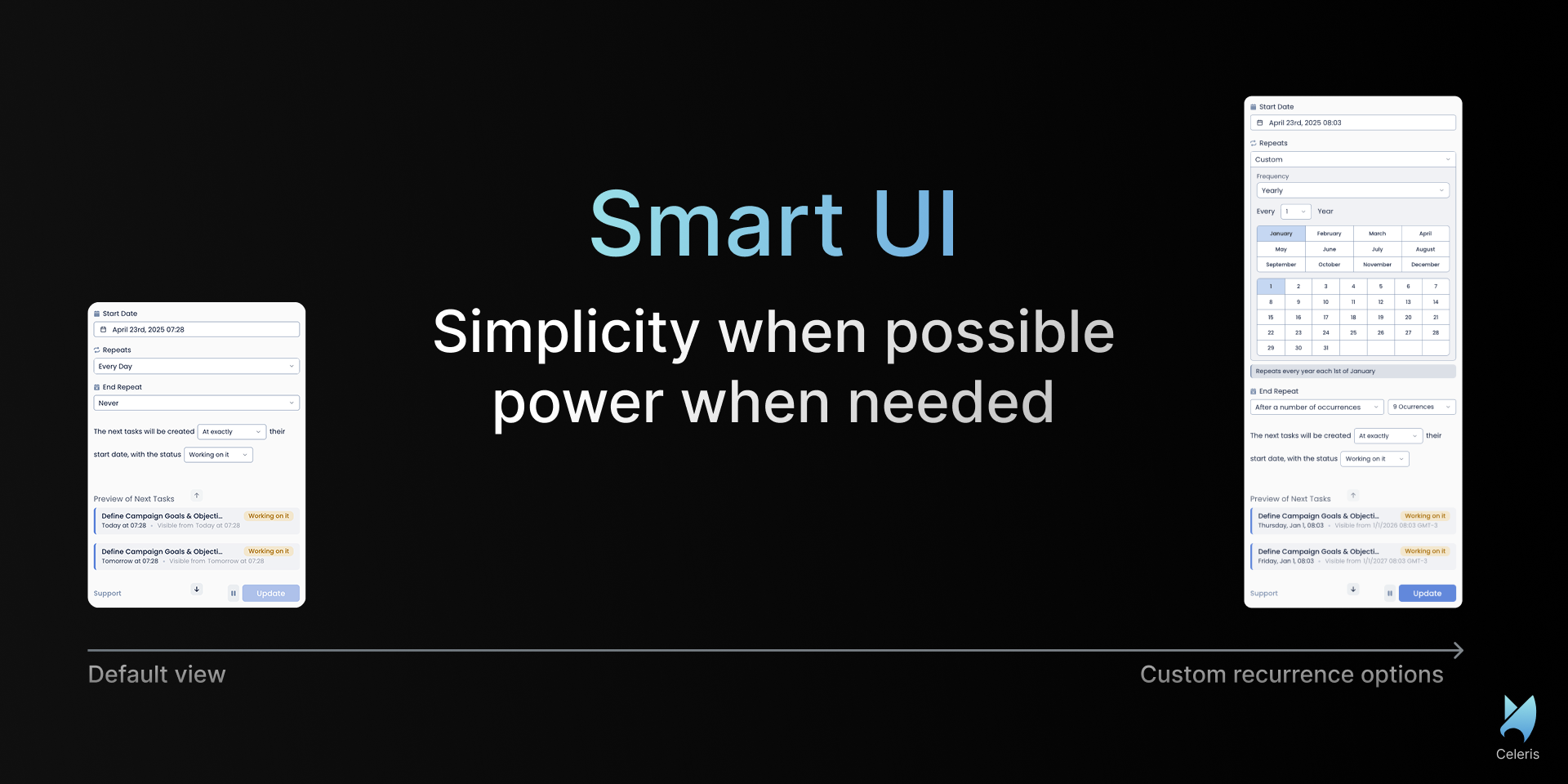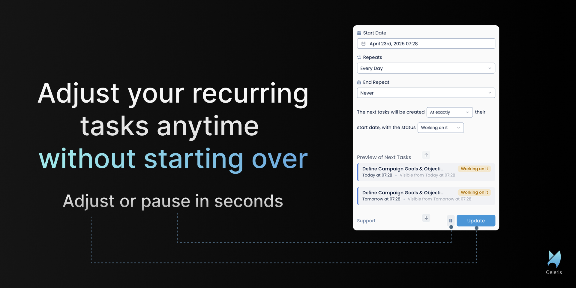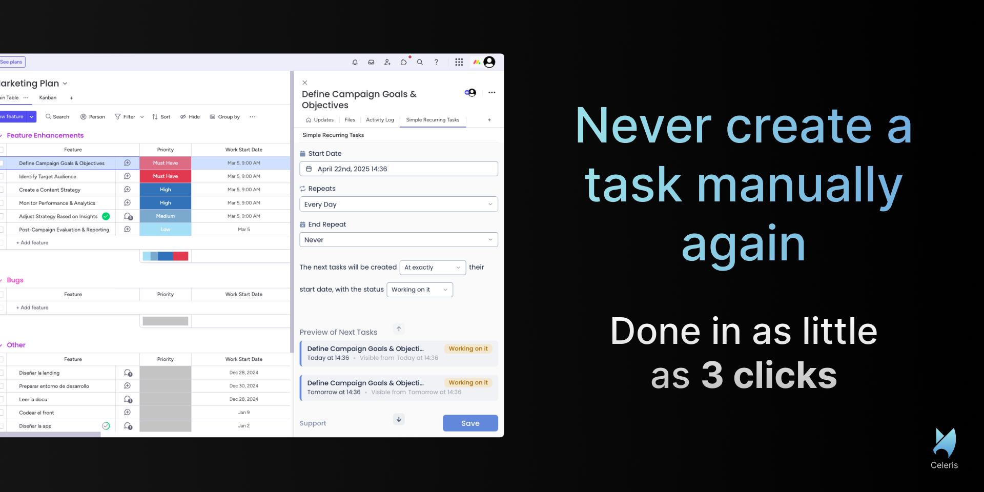 "description": "<p><strong>Stop wasting time re-creating tasks</strong></p><p><br></p><p>Every week you set up the same work again.</p><p>Simple Recurring Tasks fixes that.</p><p><br></p><p>Pick an item in monday.com.</p><p>Set when it repeats.</p><p>It shows up on time every time.</p><p>No automations. No hacks. Just done.</p><p><br></p><p><strong>Try it free</strong></p><p><br></p><p>You get two weeks on us.</p><p>No credit card.</p><p>If it doesn’t save you hours don’t pay.</p><p><br></p><p><strong>Watch and learn</strong></p><p><br></p><p>Need help getting started</p><p>Watch <a href=\"https://www.youtube.com/watch?v=O4znUH48zYI\" rel=\"noopener noreferrer\" target=\"_blank\">a 40 second video that shows exactly how it works</a></p><p>Or visit our <a href=\"https://teamceleris.com/contact\" rel=\"noopener noreferrer\" target=\"_blank\">support page</a> for quick answers and direct help</p><p><br></p><p><strong>Why teams switch</strong></p><p><br></p><p>🛡️ Privacy first 70 percent fewer permissions than the big apps</p><p>⛓️ Unlimited tasks We never cap usage</p><p>⚡ Three click setup Add recurring tasks right from the item view</p><p>🧠 Smart interface Shows only what you need</p><p>🎯 Precise timing Daily weekly or custom You decide</p><p>💻 Fully integrated Works like any monday com task Edit filter report All native</p><p>🎛️ Full control Pause or edit anytime</p><p><br></p><p>Built simpler faster and lighter</p><p>And yes about 20 percent more affordable</p><p><br></p><p>Ready to stop fighting automations and messy calendars</p><p><br></p><p><strong>Try it now risk free</strong></p><p><br></p><p>Start free today</p><p>Built by monday com users for monday com users</p><p>If it doesn’t save you hours don’t pay</p>",