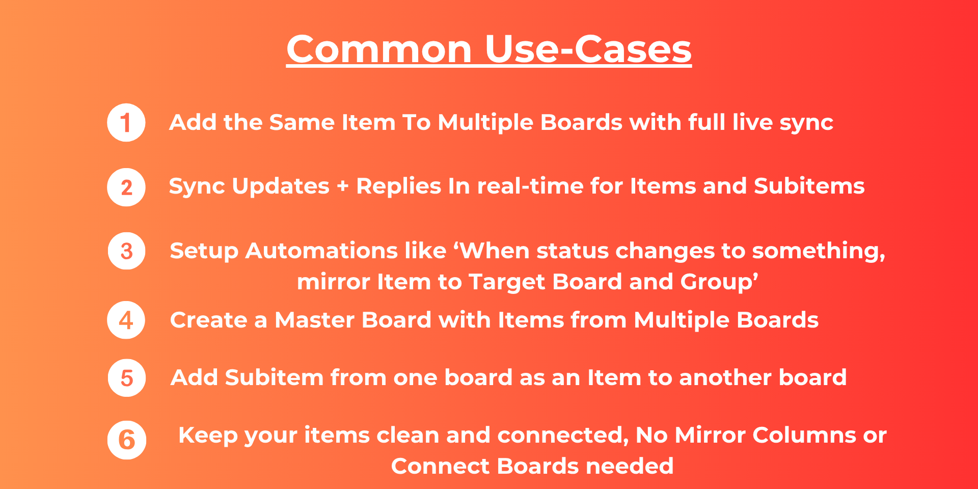 JD: Mirror items across boards. It syncs columns, sub-items & files. This app saved me so much time by keeping all my items in sync automatically. No copy-paste; one source of truth. Very reliable. Easy Setup and affordable pricing. Highly Recommended!.