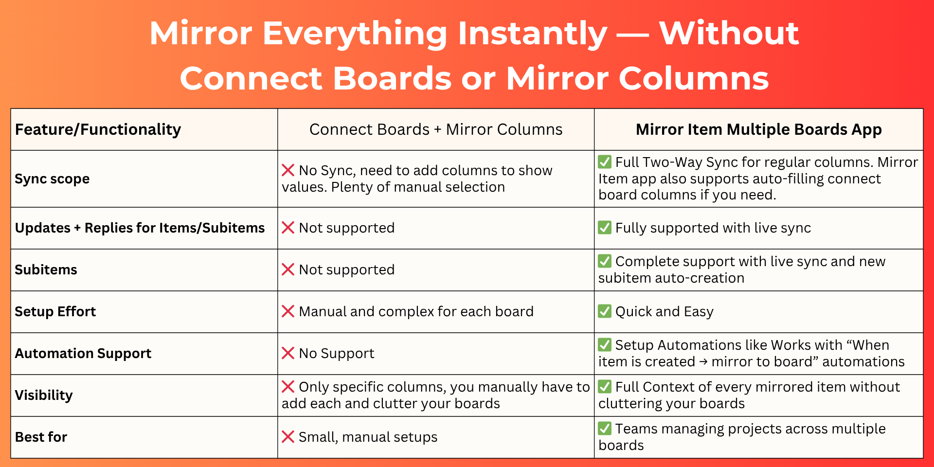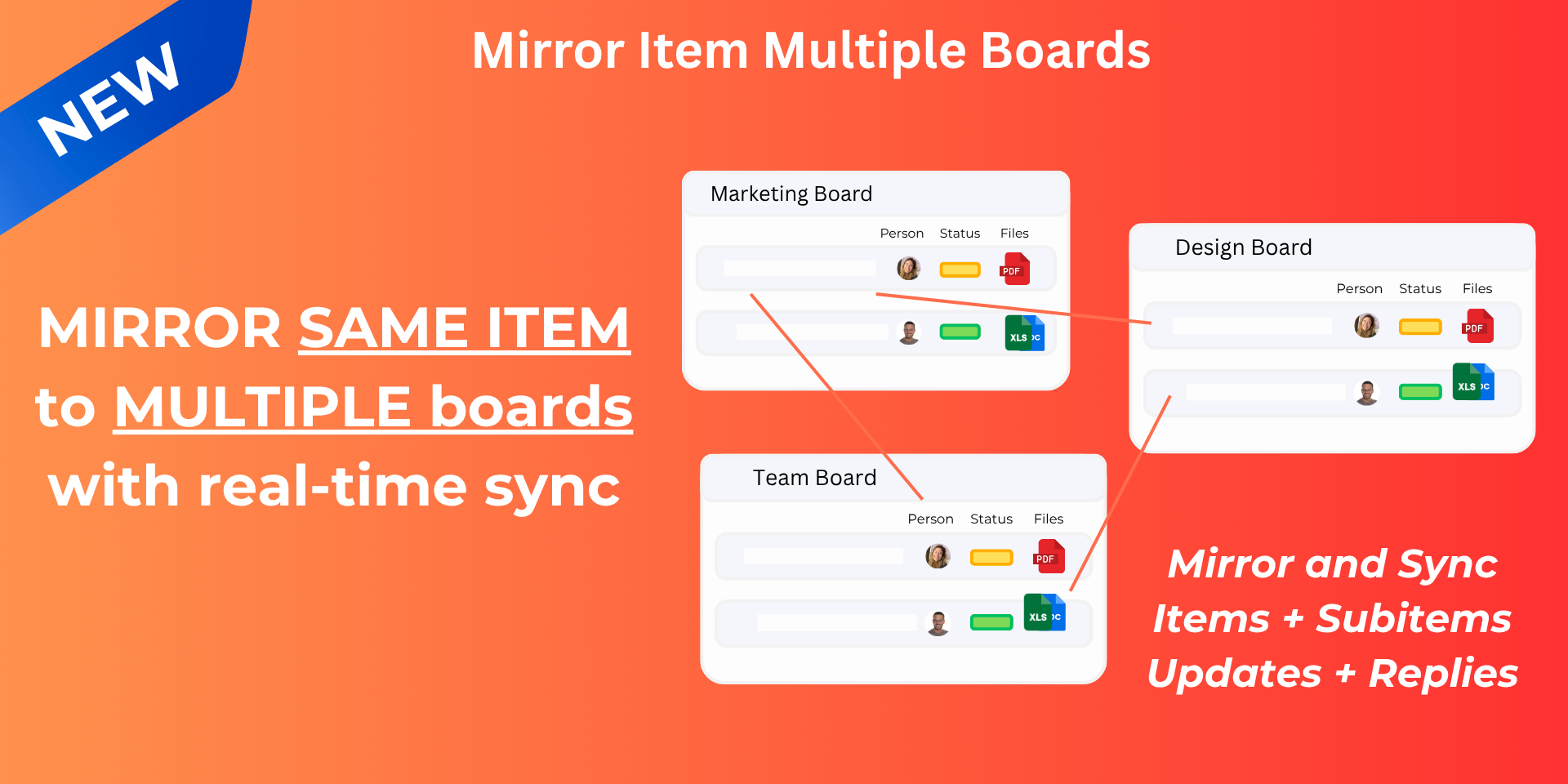 Mirror Item Multiple Boards fixes that completely. Share one item across all your boards and keep everything — updates, replies, files, subitems → perfectly in sync.