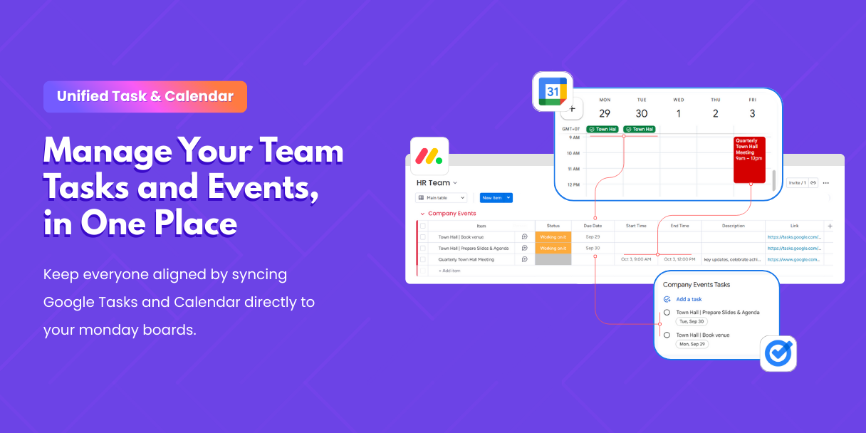 π Unified scheduling β Manage tasks and events together in monday.com, aligned with Googleβs task and calendar views.