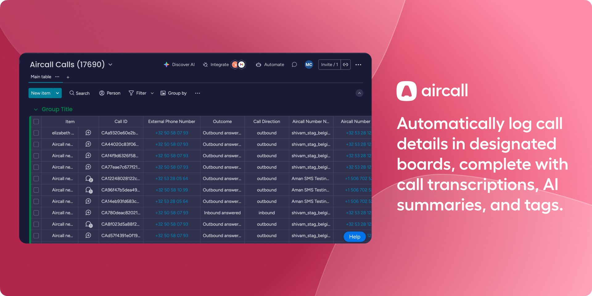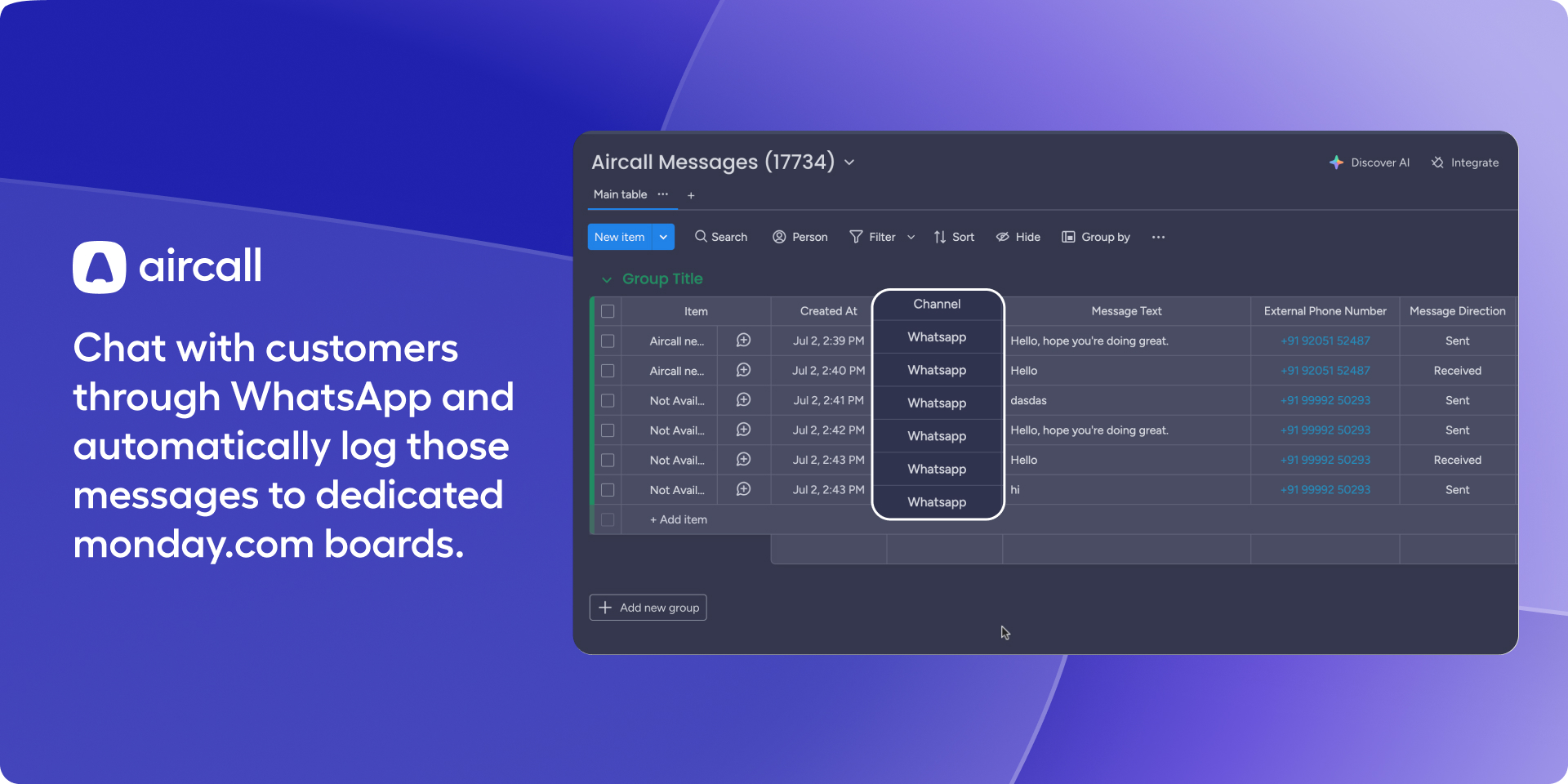 Connect Aircall with monday.com to automatically log data like calls, call recordings, transcriptions, SMS, tags, and WhatsApp messages directly into your boards. It’s the easiest way to unify customer communication with your team’s workflows.