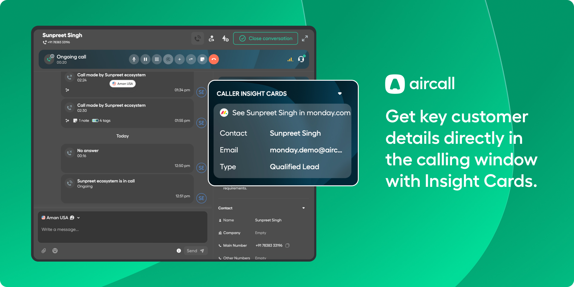 Start Every Call with Context. Aircall’s Insight Cards appear the moment a call starts, displaying key contact details and communication history. No digging required—just the info you need to personalize every conversation.