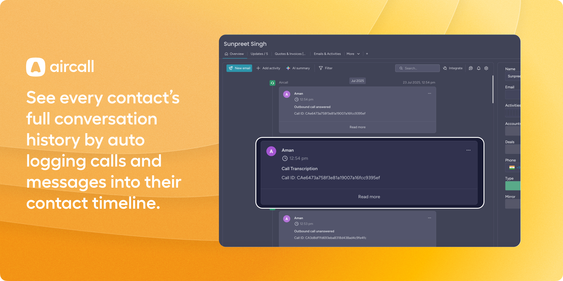 Create new contacts from Aircall calls and keep contact details up to date across both platforms.