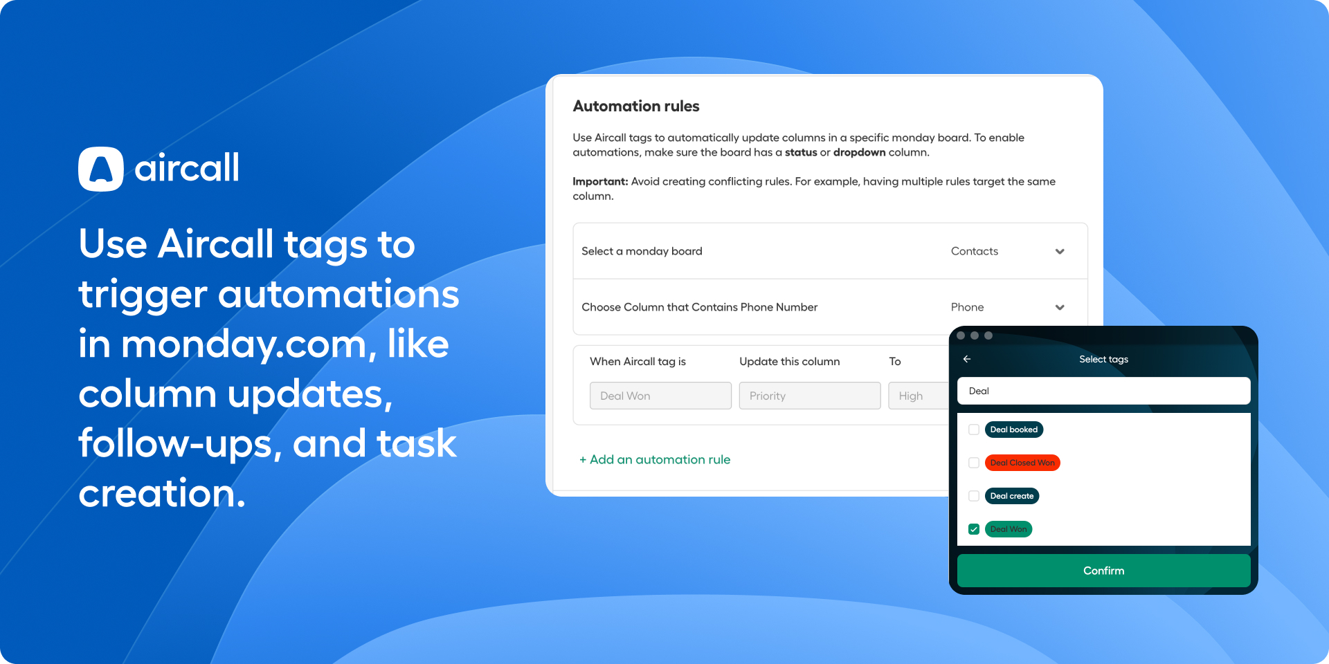 "description": "<p><strong>Turn Every Customer Interaction Into Actionable Data</strong></p><p>Connect Aircall with <a href=\"http://monday.com/\" rel=\"noopener noreferrer\" target=\"_blank\">monday.com</a> to automatically log data like calls, call recordings, transcriptions, SMS, tags, and WhatsApp messages directly into your boards. It’s the easiest way to unify customer communication with your team’s workflows.</p><p><br></p><p><strong>Why Teams Love Aircall + </strong><a href=\"http://monday.com/\" rel=\"noopener noreferrer\" target=\"_blank\"><strong>monday.com</strong></a></p><p>Start Every Call with Context. Aircall’s Insight Cards appear the moment a call starts, displaying key contact details and communication history. No digging required—just the info you need to personalize every conversation.</p><p><br></p><p><strong>Automate Workflows with Call Data</strong></p><p>Log calls, transcriptions, and tags in <a href=\"http://monday.com/\" rel=\"noopener noreferrer\" target=\"_blank\">monday.com</a>. Use that data to trigger custom automations like follow-ups, ticket creation, or task movement without manual work.</p><p><br></p><p><strong>Get Instant Visibility</strong></p><p>Use customizable tags like “Qualified Lead” or “Support Issue” to categorize calls. Track and filter call activity in <a href=\"http://monday.com/\" rel=\"noopener noreferrer\" target=\"_blank\">monday.com</a> for a clear picture of team performance.</p><p><br></p><p><strong>Sync Contacts Automatically</strong></p><p>Create new contacts from Aircall calls and keep contact details up to date across both platforms.</p><p><br></p><p><strong>Fast & Secure Setup</strong></p><p>Install the Aircall integration from the <a href=\"http://monday.com/\" rel=\"noopener noreferrer\" target=\"_blank\">monday.com</a> or Aircall marketplace in minutes. No code or IT support needed.</p><p><br></p><p><strong>Want to learn more?</strong></p><p><a href=\"https://aircall.io/request-a-demo/?utm_medium=referral&utm_source=&utm_campaign=partner-marketplace-listing\" rel=\"noopener noreferrer\" target=\"_blank\">Schedule a demo</a> or reach out to our sales team at <a href=\"mailto:sales@aircall.io\" rel=\"noopener noreferrer\" target=\"_blank\">sales@aircall.io</a></p>",