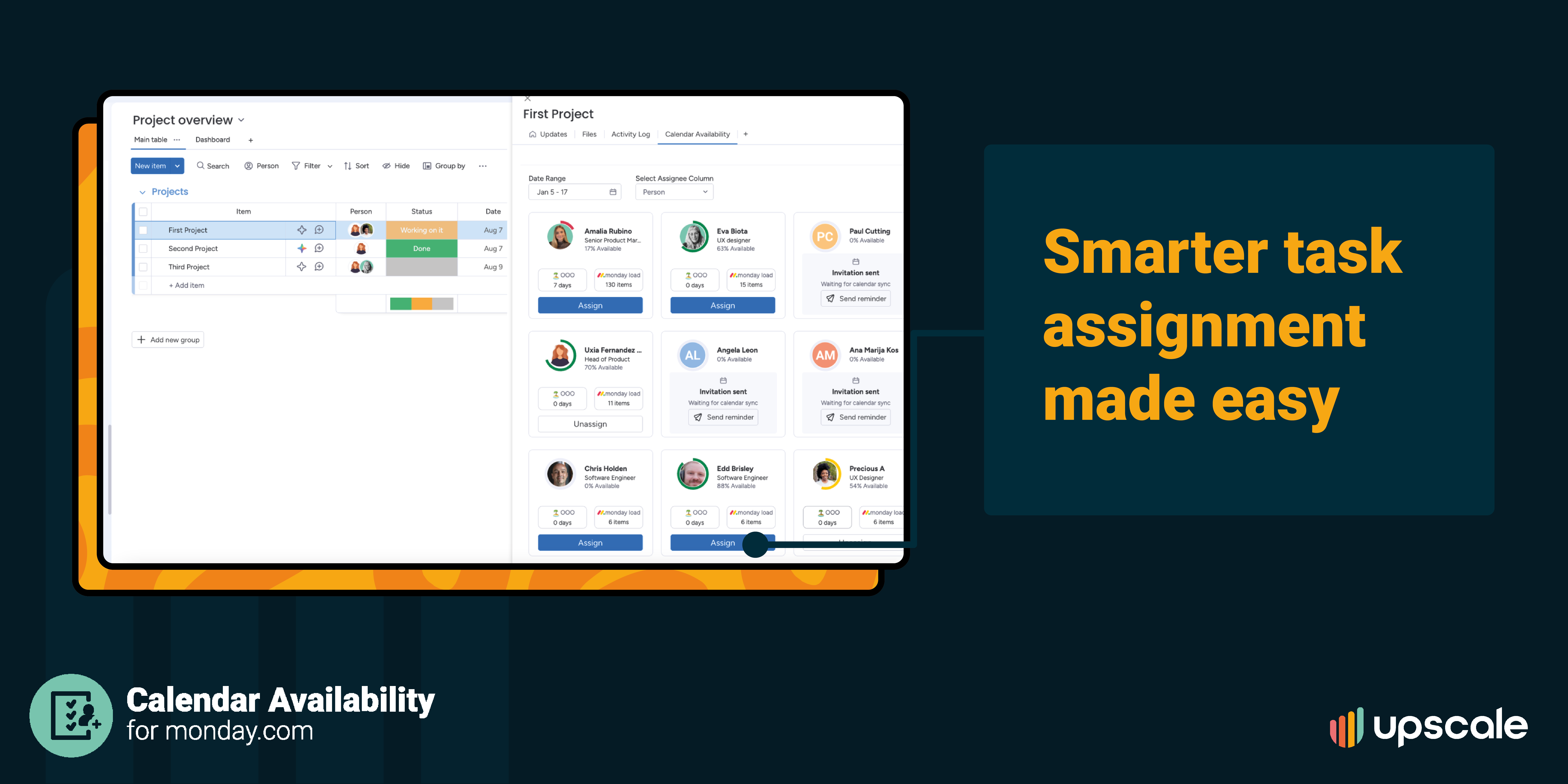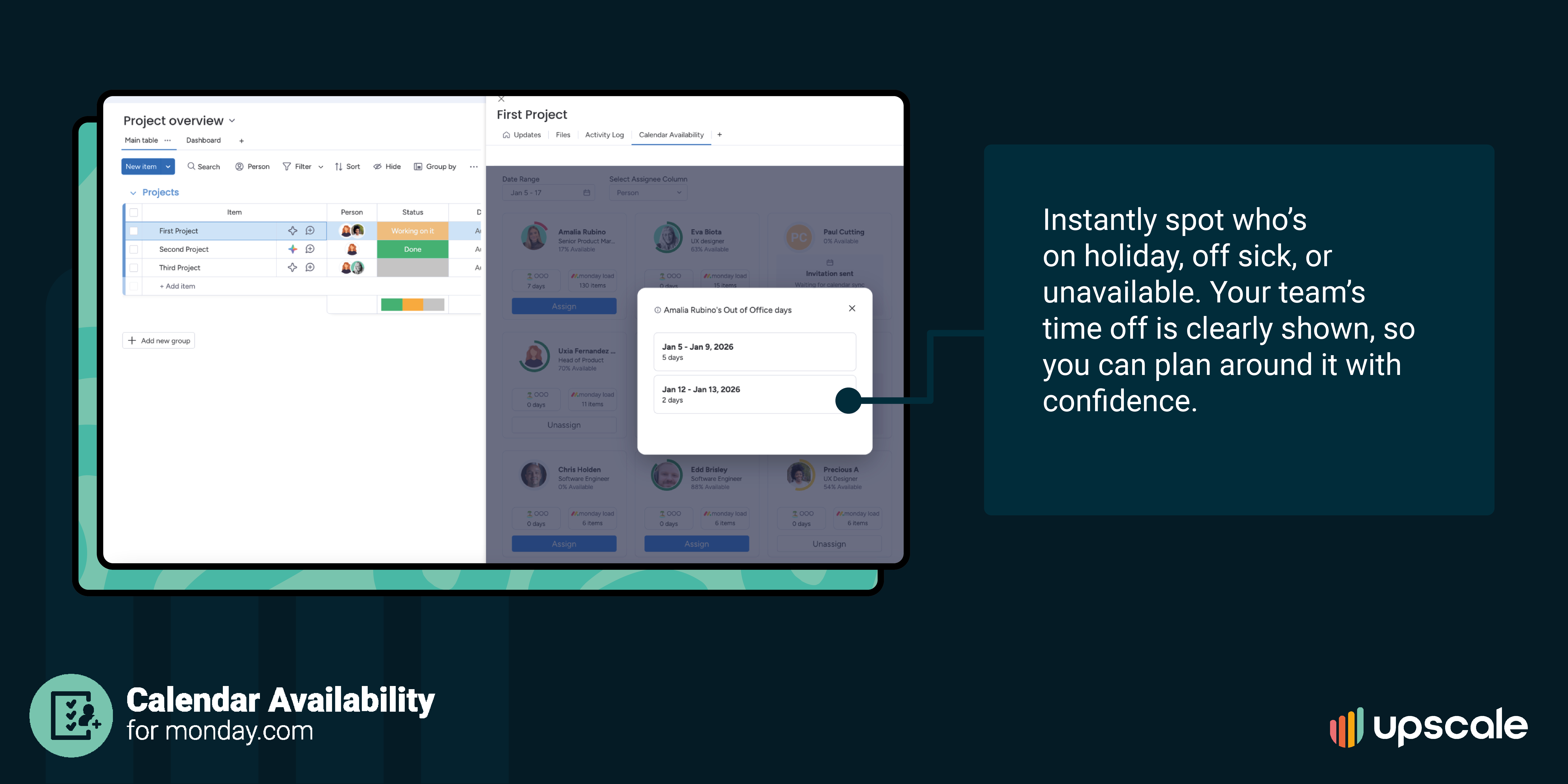 "description": "<p>Teams often struggle to assign tasks fairly and efficiently, resulting in uneven workloads, missed deadlines, and frustration for managers and team members alike. Limited visibility into real-time team availability and Out of Office days means managers must manually check multiple calendars to balance schedules.</p><p><br></p><p>Calendar Availability for monday.com transforms task management by integrating seamlessly with Outlook and Google Calendar. It provides centralized visibility of your team’s calendar, including Out of Office statuses and availability, all in one place within monday.com.</p><p><br></p><p><a href=\"https://meetings.hubspot.com/amalia-rubino-munoz/calendar-availability-\" rel=\"noopener noreferrer\" target=\"_blank\"><strong>Book a demo</strong></a><strong> with us!</strong></p><p><br></p><p>✨ What you can do with Calendar Availability:</p><p><br></p><p>🏝️ Out of office visualizer:</p><p>Instantly spot who's on holiday, off sick, or unavailable. Your team's time off is clearly shown, so you can plan around it with confidence.</p><p><br></p><p>✅ Assign tasks clearly and confidently:</p><p>Easily assign work to the right people with one shared view of ownership and availability, seamlessly synced with their <strong>Outlook and Google calendars</strong>.</p><p><br></p><p>♻️ Rebalance workloads quickly:</p><p>When plans shift (as they always do), see who's at full capacity and make changes fast, without disrupting your team's flow.</p><p><br></p><p>👀 Get visibility without the back-and-forth:</p><p>No more silent overloads, or \"who's doing this or on vacation?\" moments. Everyone stays looped in and on the same page.</p><p><br></p><p>📨 Send out calendar invites to bring others in:</p><p>Pick how many invites your team needs! Invite teammates to connect their calendars and start collaborating instantly. Each person will get an email (and a Slack message, if they use Slack) with a link to join your task planning flow.</p><p><br></p><p>⏳ Instantly preview team availability:</p><p>Filter by date range or assignee to see who's ready for new work. Assign in half the time and filter out unavailable or overloaded team members.</p>",