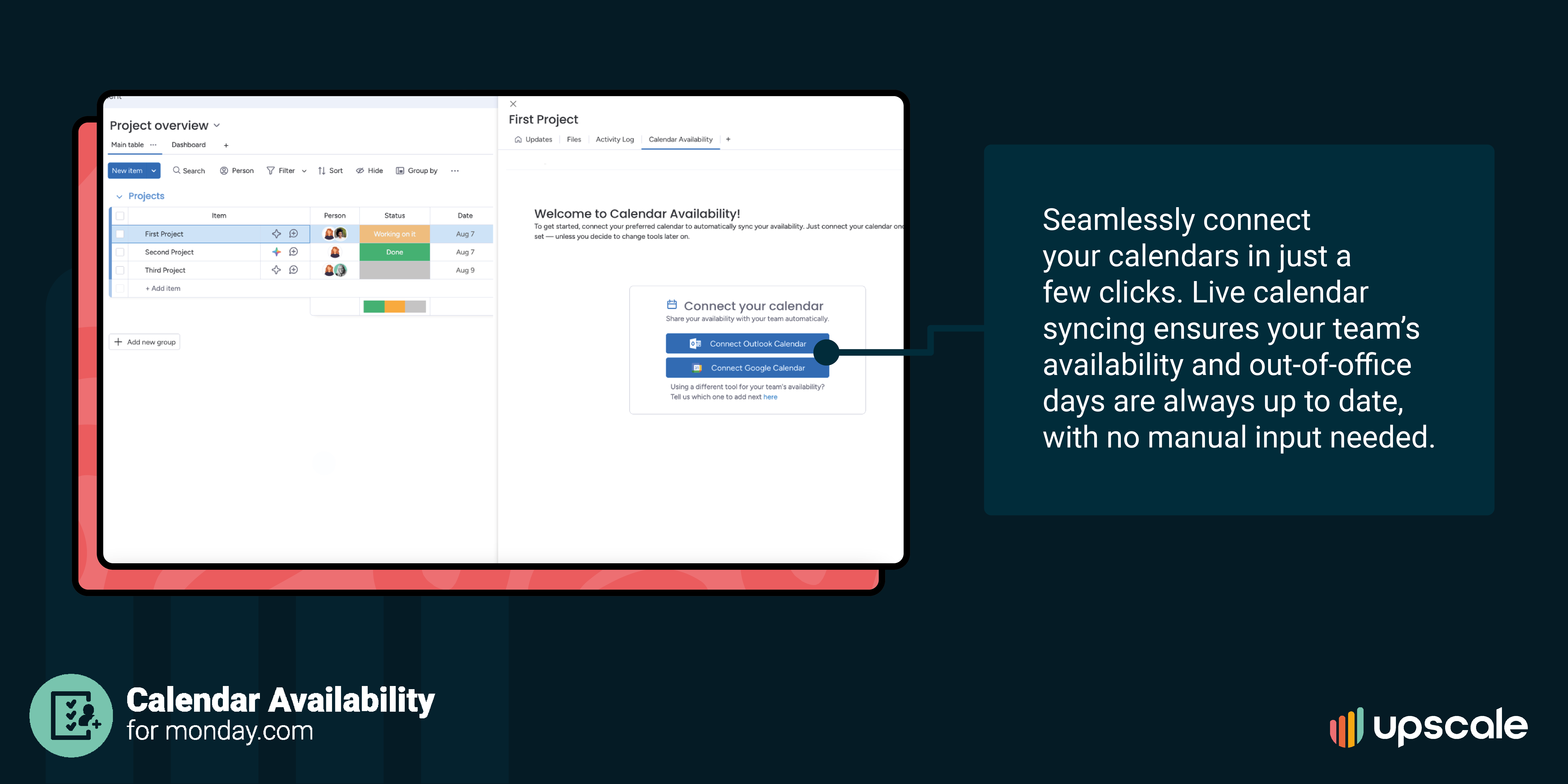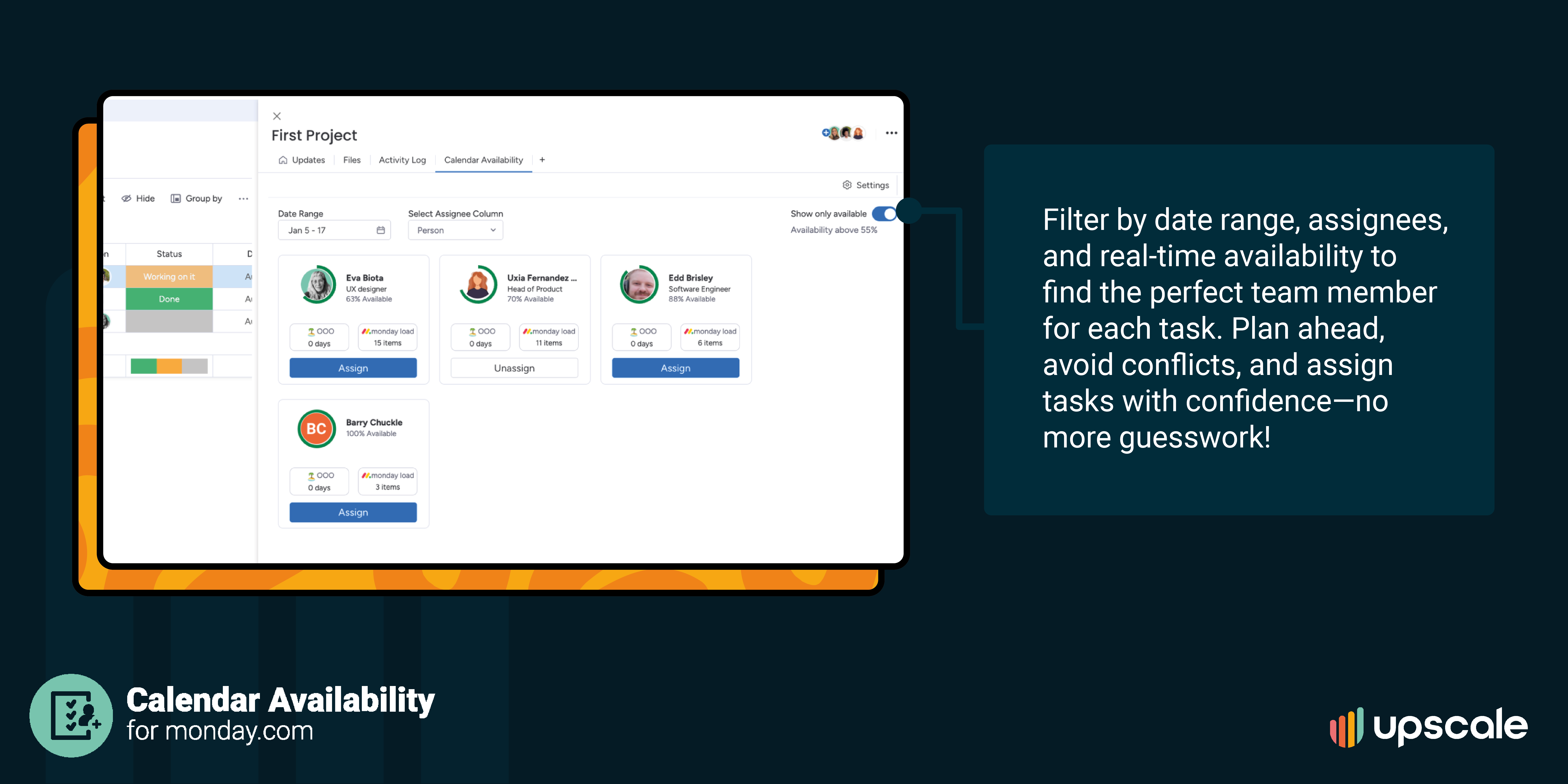 Calendar Availability for monday.com transforms task management by integrating seamlessly with Outlook and Google Calendar. It provides centralized visibility of your team’s calendar, including Out of Office statuses and availability, all in one place within monday.com.