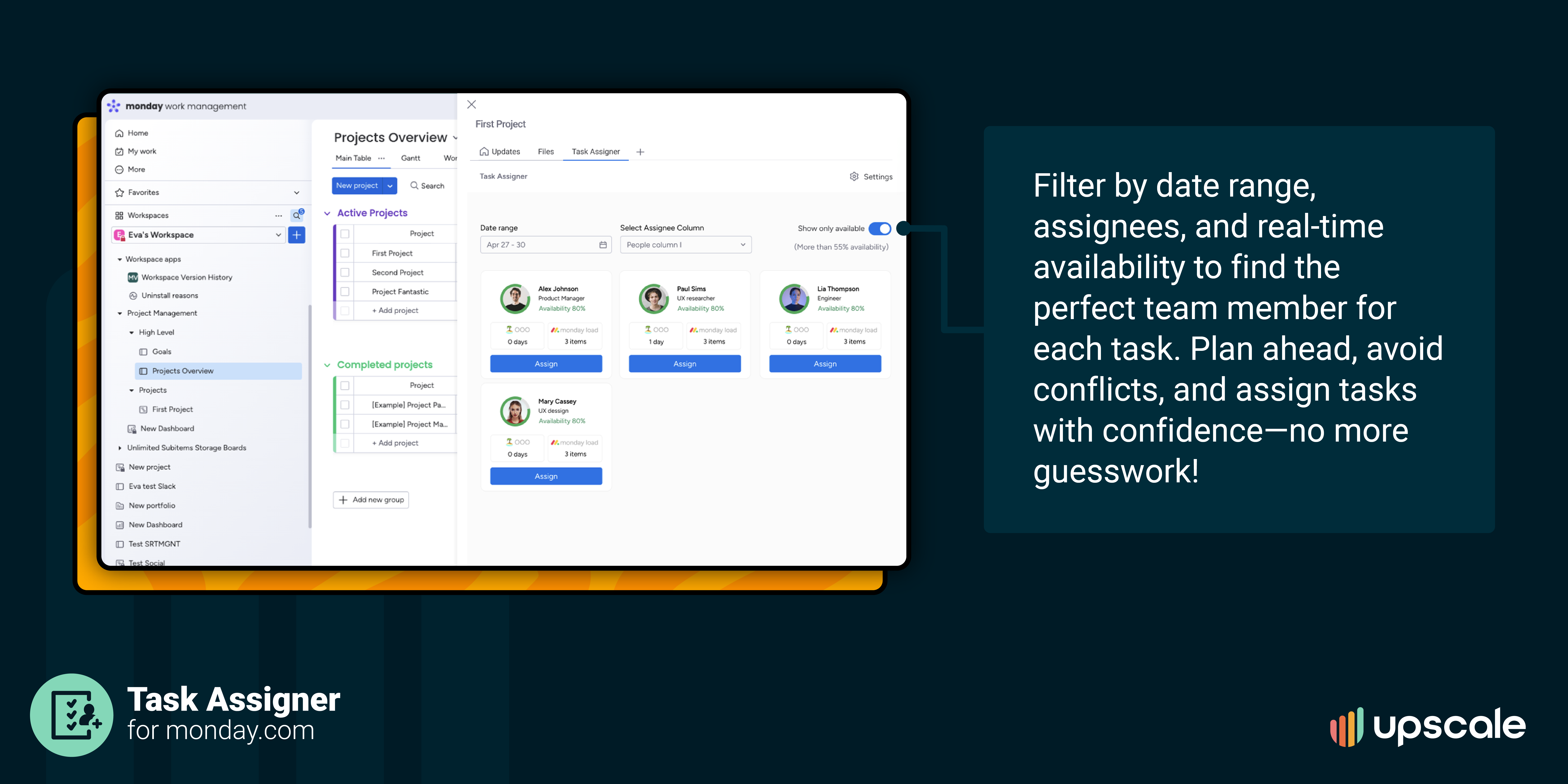 Filter by date range or assignee to see who's ready for new work. Assign in half the time and filter out unavailable or overloaded team members."