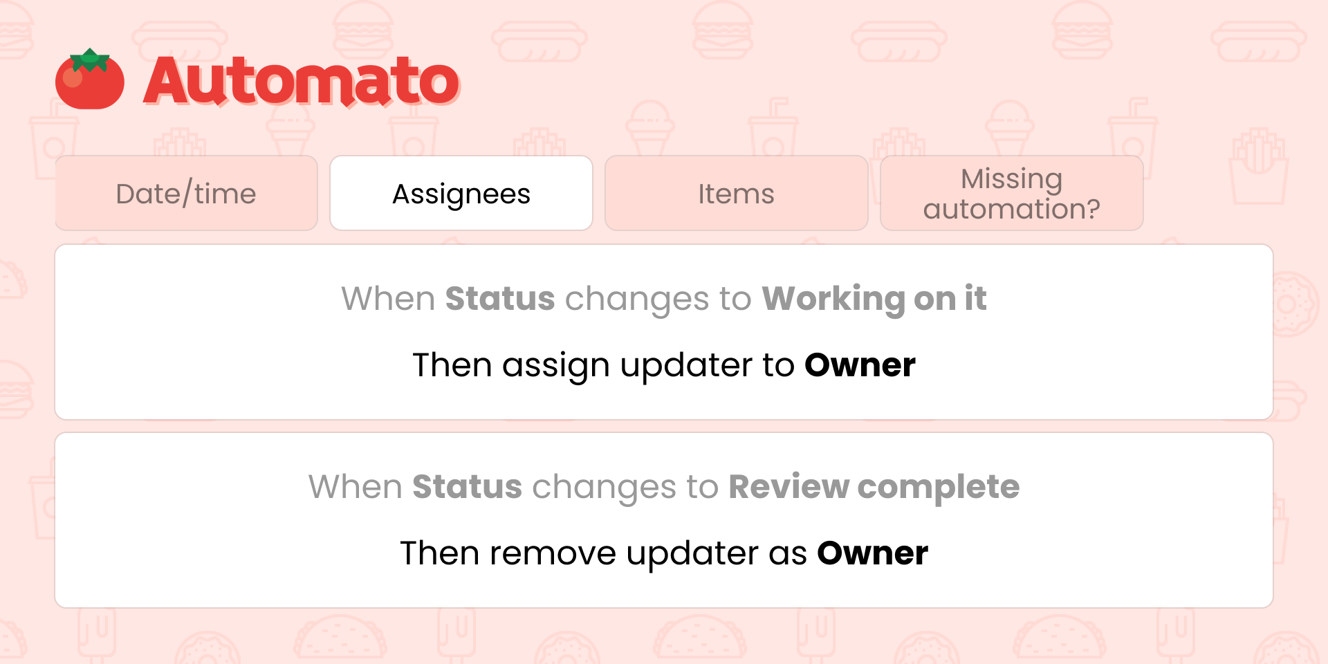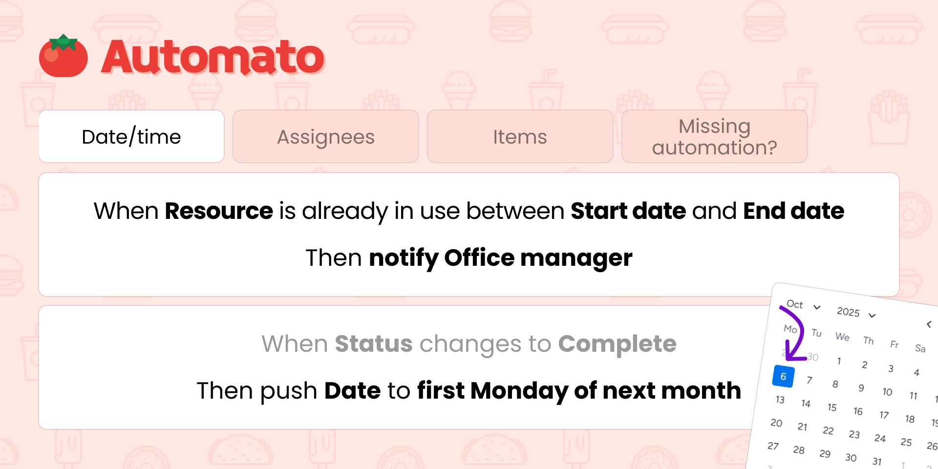"description": "<p>Avoid scheduling conflicts, schedule the next meeting on Tuesday, or respond to people making updates; you can do it with 🍅 Automato.</p><p><strong>💥 Avoid double booking</strong></p><p>Do you schedule meeting rooms, work, or company vehicles? Automato identifies the conflict proactively and raises the issue.</p><p>⏩ <strong>Advanced date pushing</strong></p><p>Push a date to next Wednesday, pull it 5 business days forward, or push it to the second Tuesday of next month; you can cook it up with Automato.</p><p>📢 <strong>Respond to people making updates</strong></p><p>Automatically notify your team member that they just made a double booking, or assign the team member that changed a status to that task.</p><p>🧹 <strong>Keep your board organized</strong></p><p>Remove the <em>(copy)</em> suffix from items and subitems after duplicating, move your item to the top/bottom of its group, or clear an item's status when it's restored from the archive.</p><p>️📝 <strong>Work with text columns</strong></p><p>Write a message to a text column.</p><p><a href=\"https://automagical.work/automato/automations?utm_source=marketplace&utm_content=description\" rel=\"noopener noreferrer\" target=\"_blank\">⟨ View all available automations ⟩</a></p><p>Craving an automation we haven’t cooked up yet? Reach out to our responsive support team and we’ll add it to the menu.</p>",