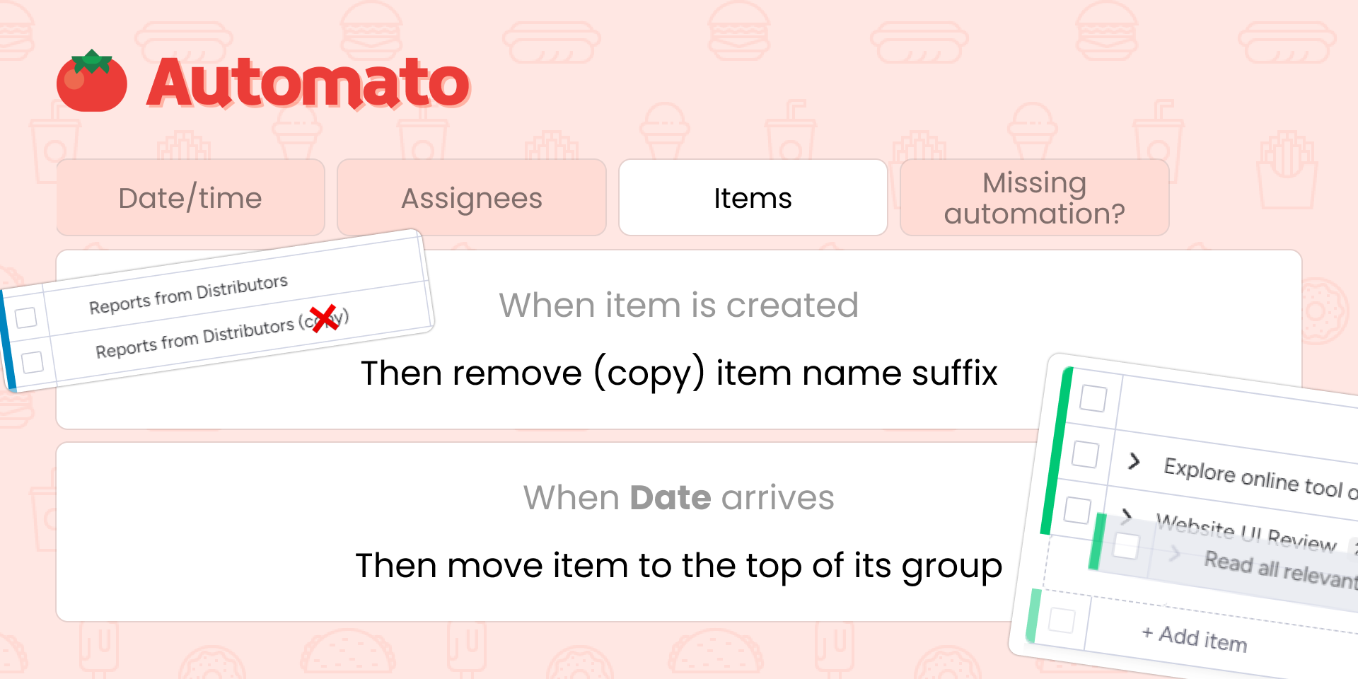 Remove the (copy) suffix from items and subitems after duplicating, move your item to the top/bottom of its group, or clear an item's status when it's restored from the archive.