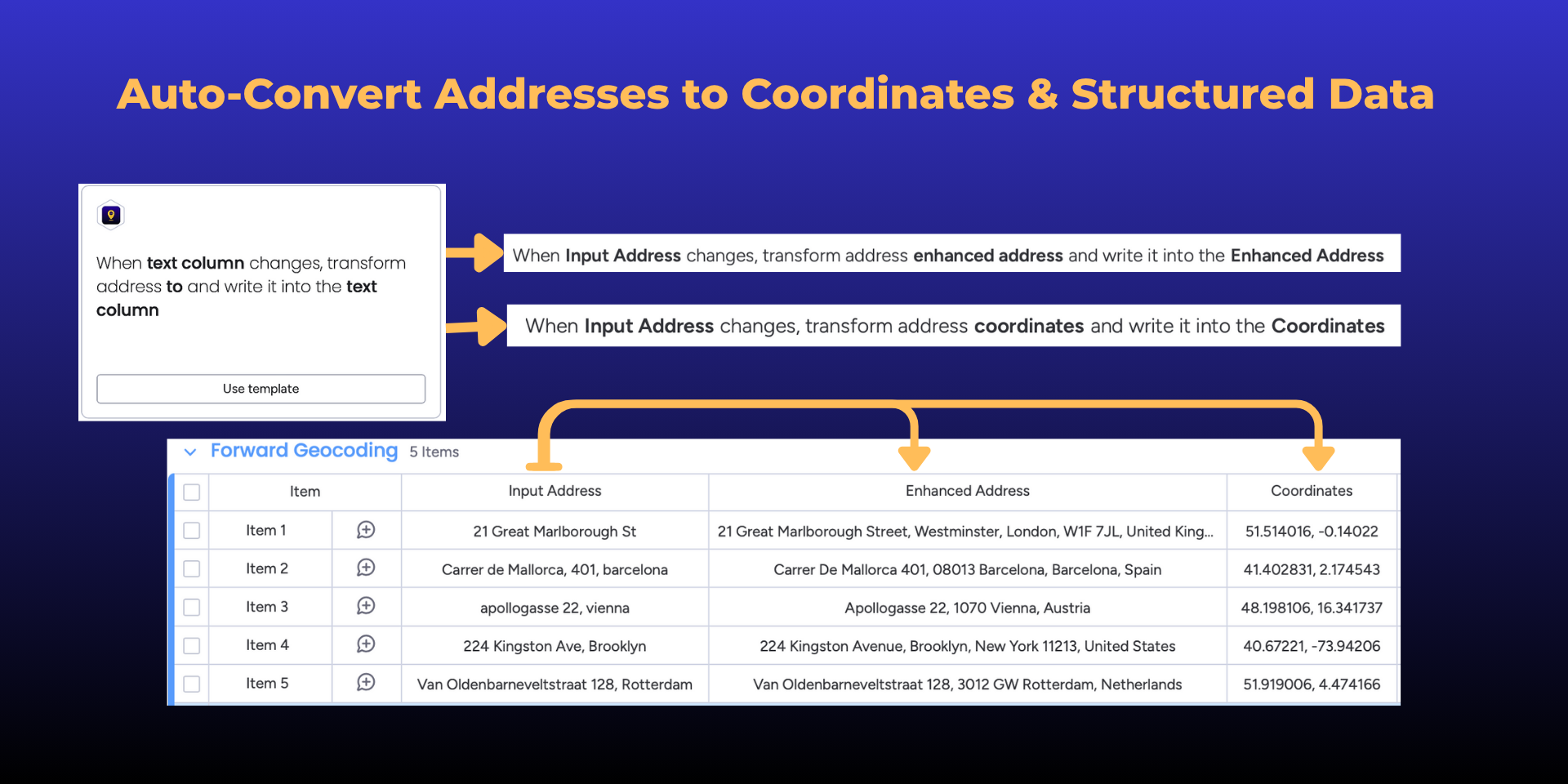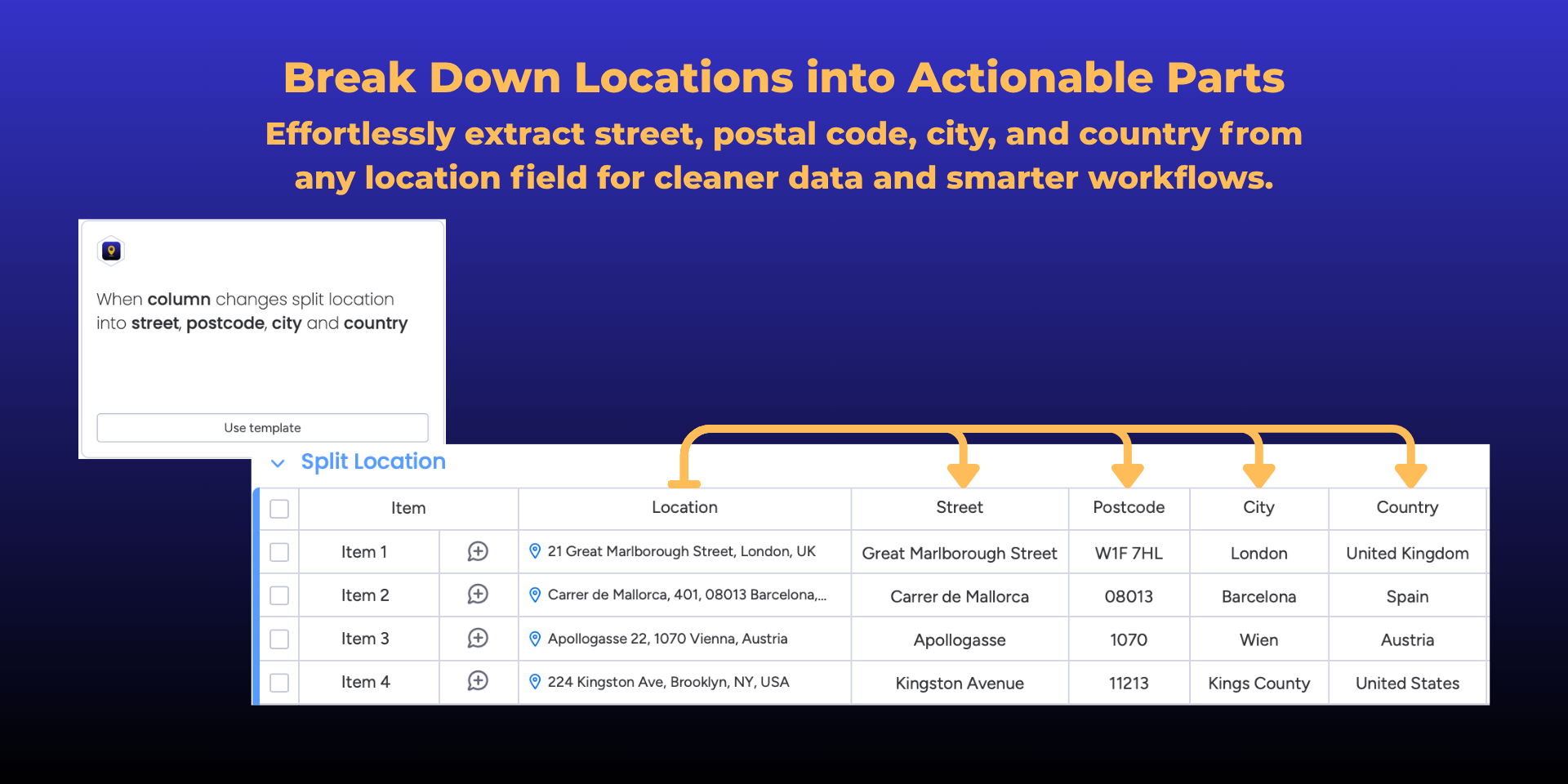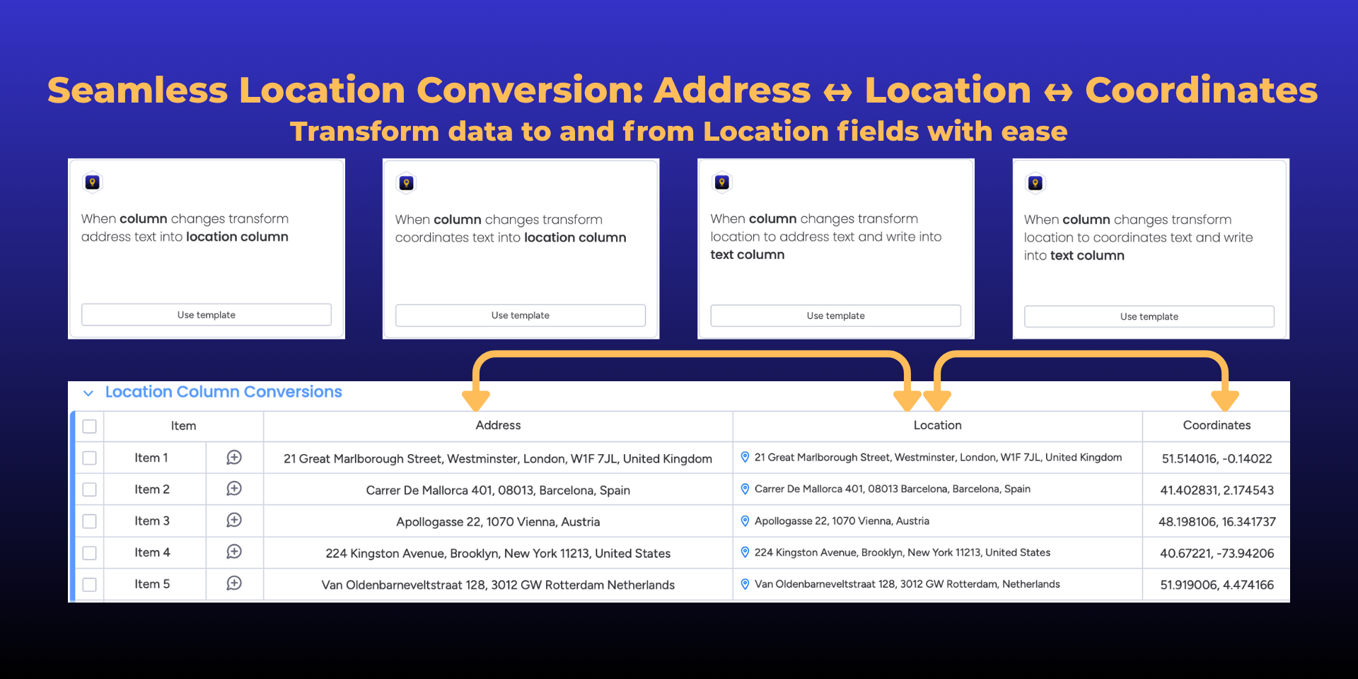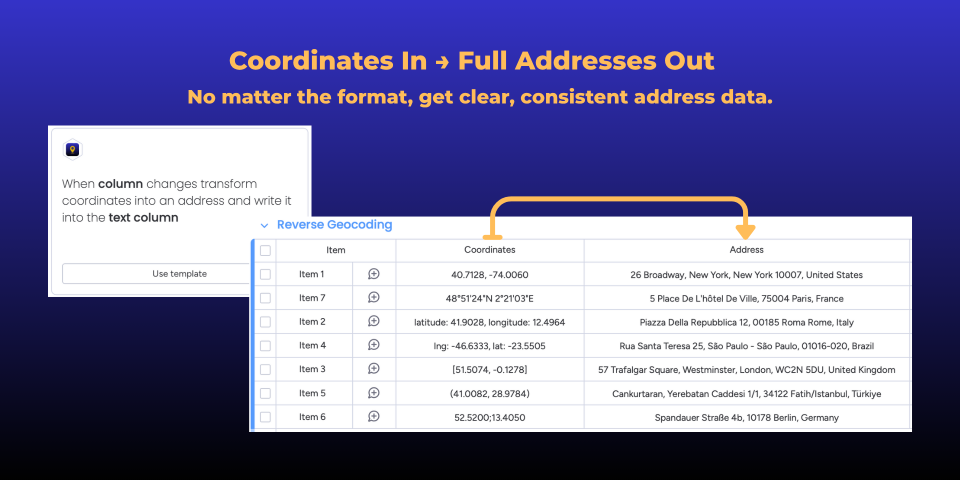 Parse address or coordinate strings directly into monday.com’s Location Column format.