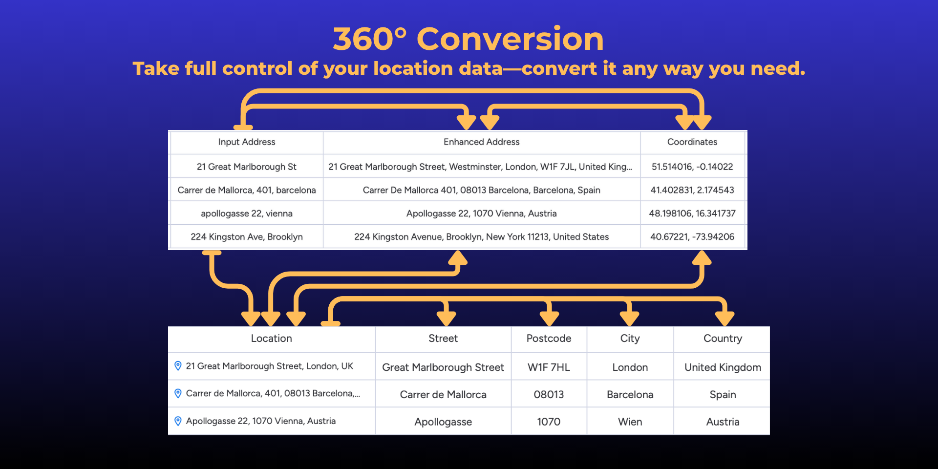 Convert between street addresses and latitude/longitude in both directions instantly.