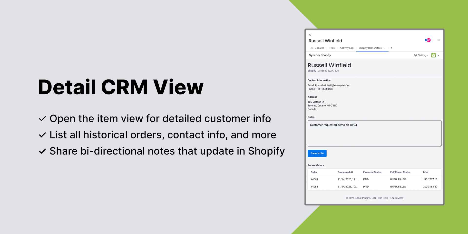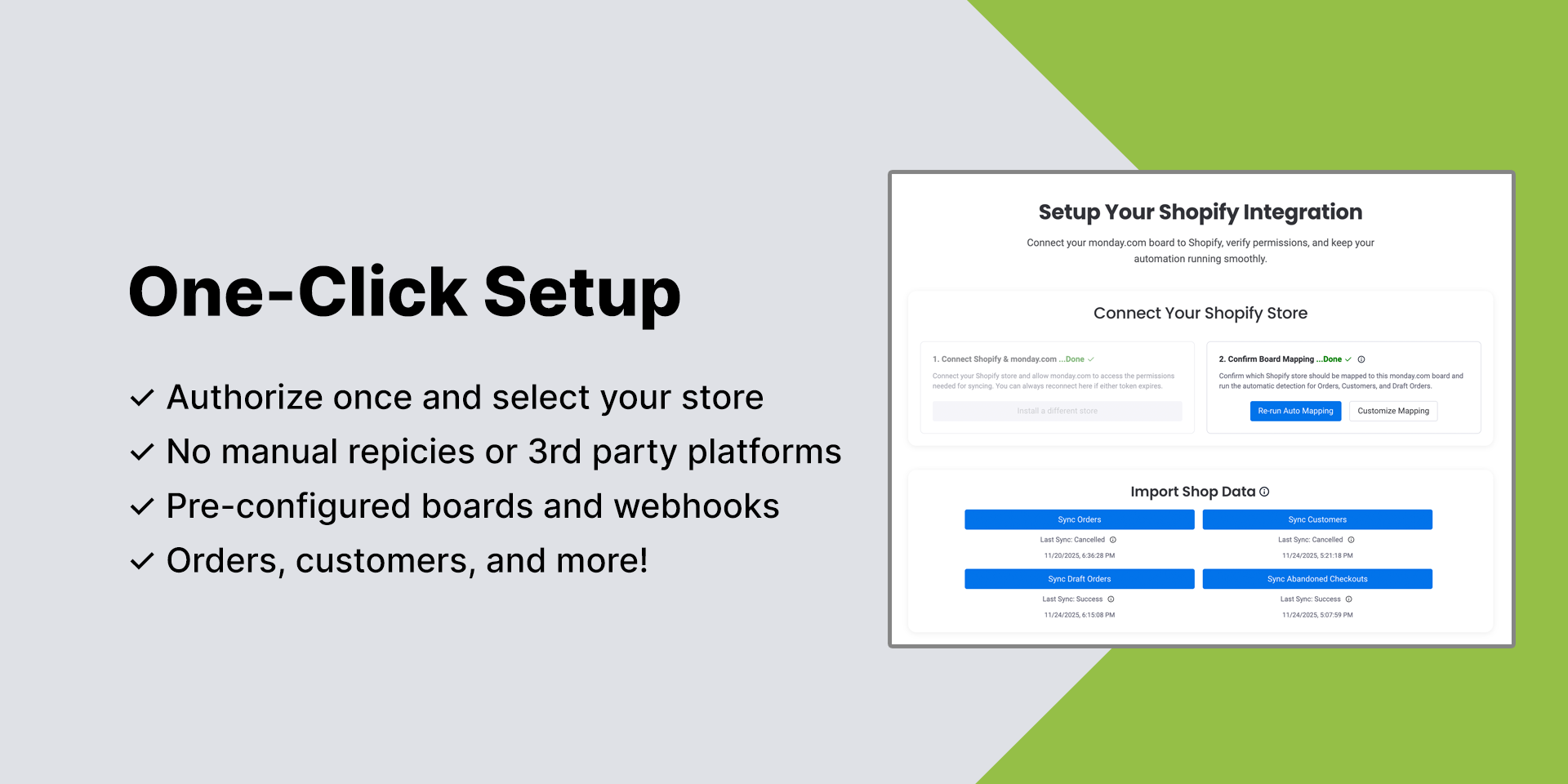 "description": "<p>Sync for Shopify brings all your store’s orders, customers, products, customers and more directly into your monday.com boards. Are you ready to experience a hassle-free setup and reliable 2-way data sync between the two platforms? Install and try out our pre-configured workspace templates now!</p><p><br></p><p>🔑 Key Features</p><p><br></p><p><strong>Orders</strong> - track fulfillment, cancellations, and returns in real time</p><p><strong>Customers</strong> - mirror customer details and segment them in monday.com for follow-ups</p><p><strong>Abandoned Checkouts</strong> - followup with customers that started checkout but didn’t purchase</p><p><strong>Historical Data Import</strong> - immediately start importing all historical data to get up and running quickly</p><p><strong>Shared Notes</strong> - sync notes on items bi-directionally between the two platforms</p><p><strong>Collaboration</strong> - give sales, ops, and support teams visibility into the same synced data.</p><p><strong>Multiple Stores</strong> - One app for all your stores, no extra fees for additional stores</p><p><strong>Products & Inventory</strong> - keep product data synced across your workflows. (Coming Soon!)</p><p><br></p><p>✨ Why Shopify Sync</p><p><br></p><p><strong>Real-Time Data</strong> - we don’t just sync new items, we track all updates and ensure that what you see in <a href=\"http://monday.com\" rel=\"noopener noreferrer\" target=\"_blank\">monday.com</a> is live data</p><p><strong>Easy Setup</strong> - simply select your store in the setup board and your data syncs automatically, no recipes or board mapping.</p><p><strong>Historical Data</strong> - import all of your historical shop data for analysis with a click of a button, no more headaches downloading spreadsheets or 3rd party sync integrations</p><p><strong>Multi-store Support</strong> - have more than one store? No problem, you can add as many stores as you want</p><p><strong>Enterprise Security</strong> - OAuth2 login, marketplace billing, and routine security reviews from Shopify. All data flows directly from Shopify to monday.com with no 3rd party in between.</p><p><strong>Excellent Customer Support</strong> - our team is ready 24/7 to help you get started or build out new features that are unique to you</p><p><br></p><p>🚀 Try It Free</p><p><br></p><p>Install directly from the monday.com Marketplace, start a 14-day free trial, and only pay once you’re convinced.</p><p><br></p><p>Stop switching tabs. Let Sync for Shopify bring your store data straight into monday.com so your team can focus on growth.</p>",