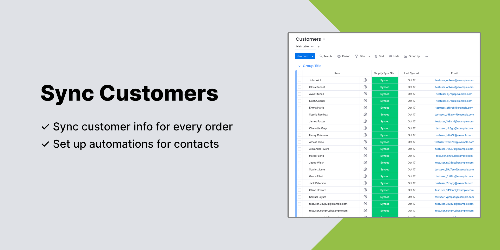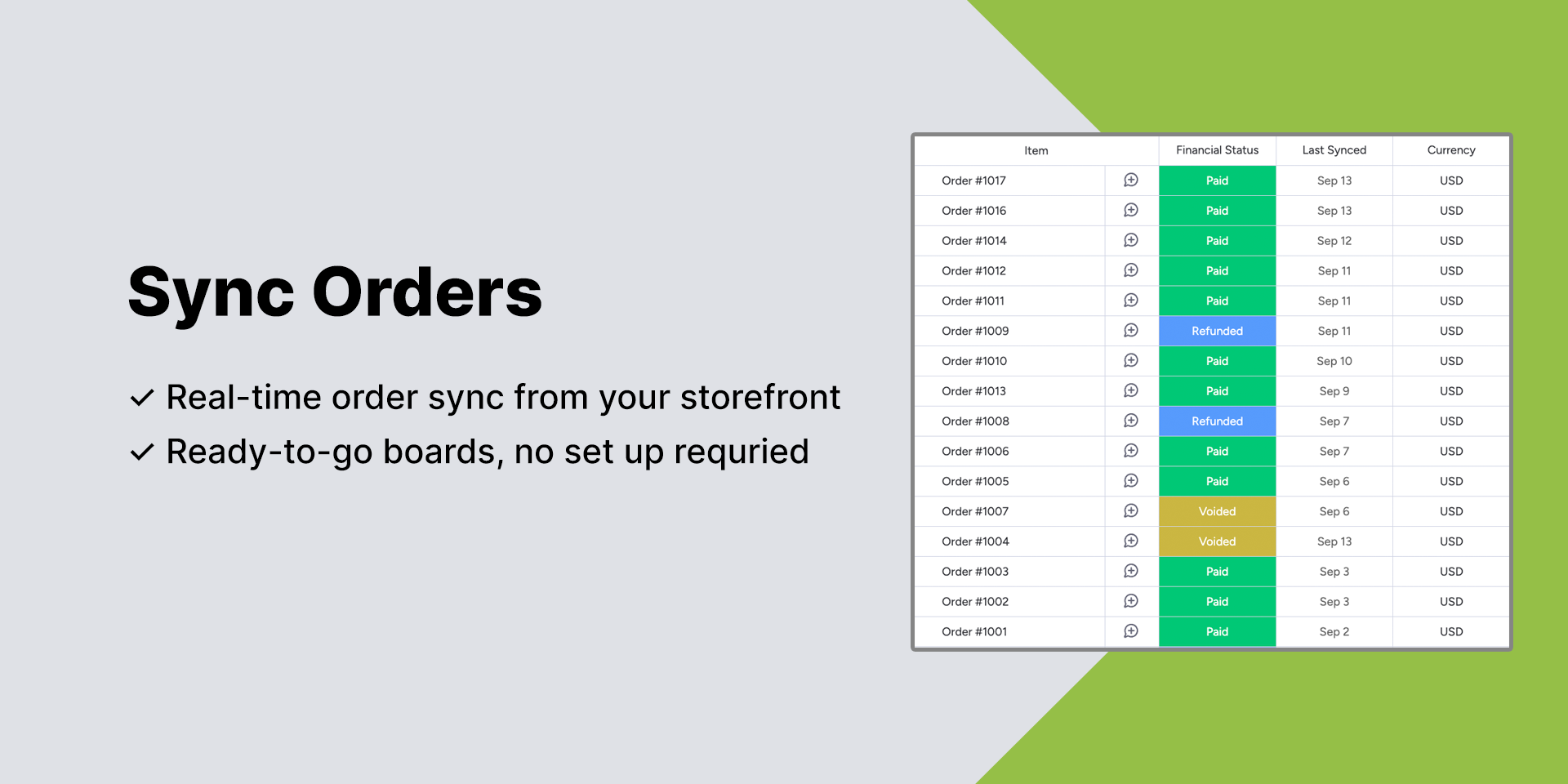 Real-time data - orders, customers, and products flow into monday.com within seconds.