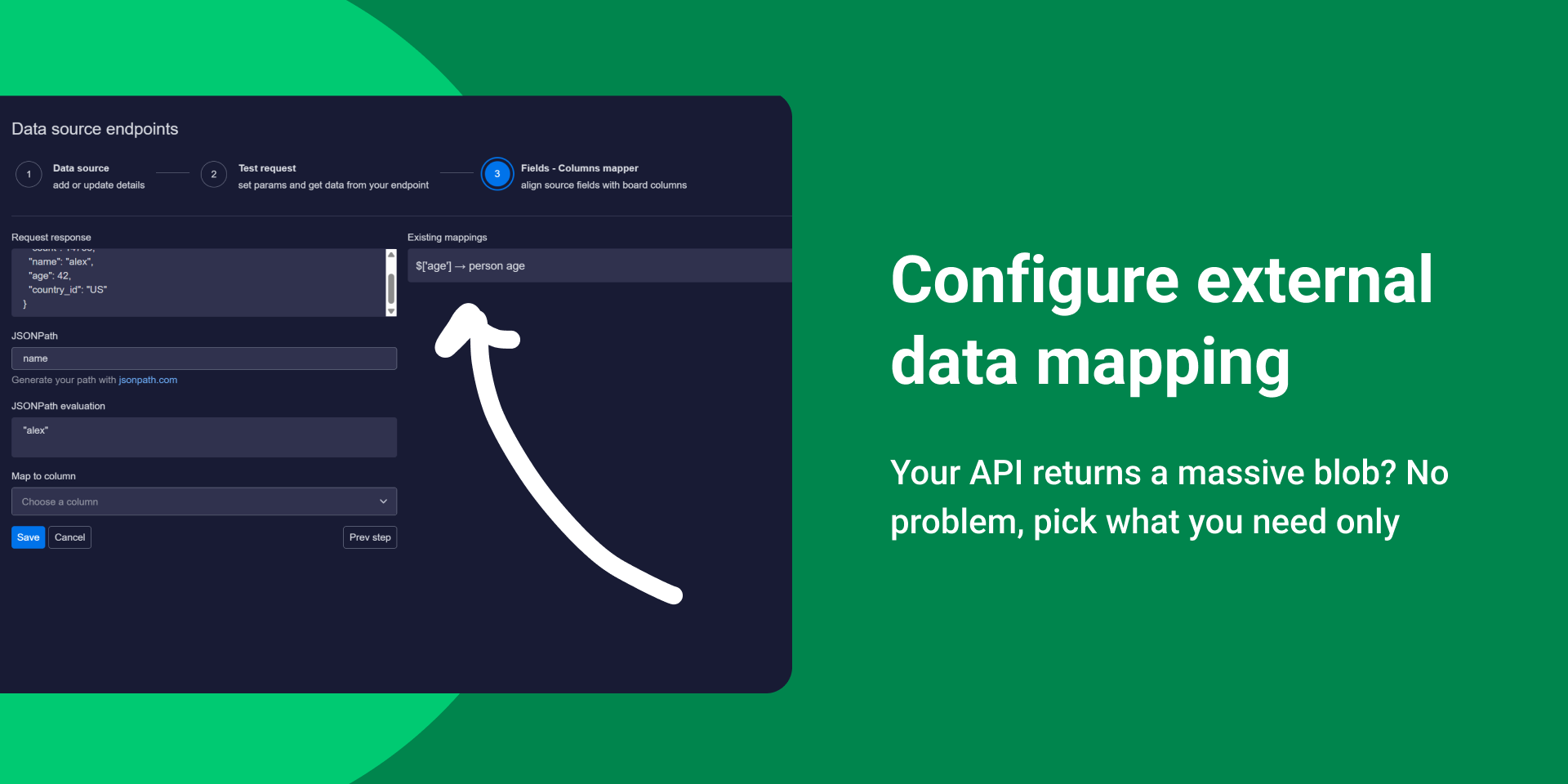 "description": "<p>Keep your <a href=\"http://monday.com/\" rel=\"noopener noreferrer\" target=\"_blank\">monday.com</a> boards in sync with the tools and data that power your business. Our app lets you connect external data sources directly into your boards, so you can see the full picture without switching between platforms.</p><p>Whether it’s metrics from a database, information from a third-party system, or updates from another tool, external data can be displayed alongside your existing board items. This helps your team work with the most accurate and up-to-date information in one place.</p><p>By bringing external data into <a href=\"http://monday.com/\" rel=\"noopener noreferrer\" target=\"_blank\">monday.com</a>, you create a single source of truth for your projects and processes. No more manual copy-pasting, fragmented workflows, or missing context—just smooth collaboration and faster decision-making.</p><p>* Please bear in mind that this app is subject to the configured data source stability. If the data source fails to provide a timely response, it will get retried.</p>",