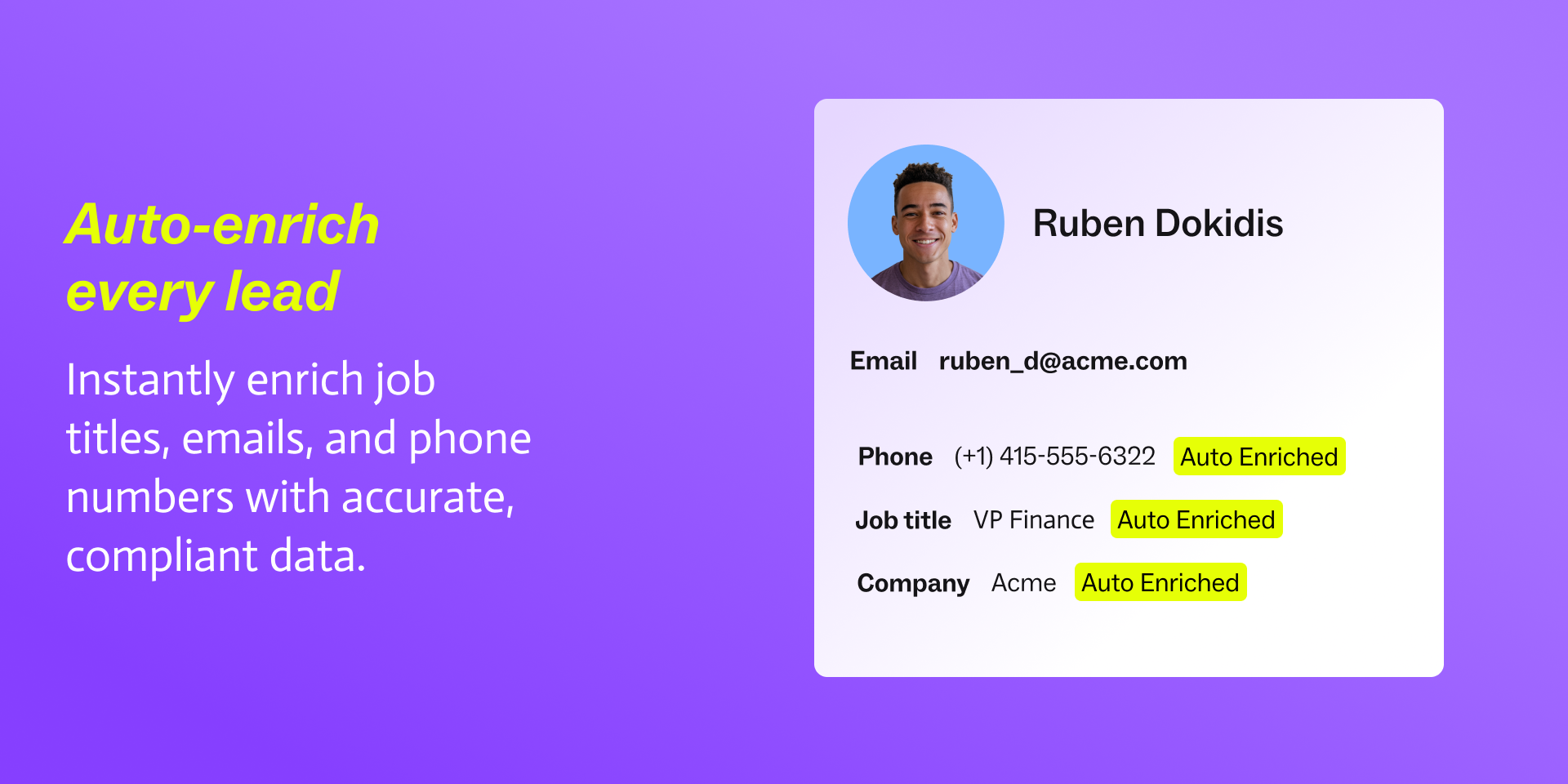 Auto-enrich records → Instantly pull verified emails, phone numbers, job titles, and company insights