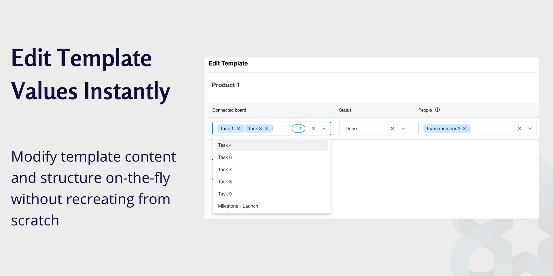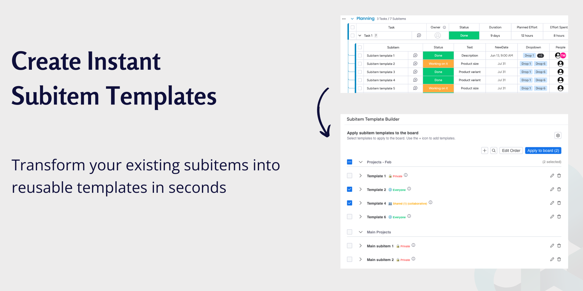 Stop recreating the same subitems over and over. Build reusable templates with pre-filled data and apply them instantly to any item. The only subitem template app with advanced sharing controls—perfect for teams that need consistency without losing flexibility.