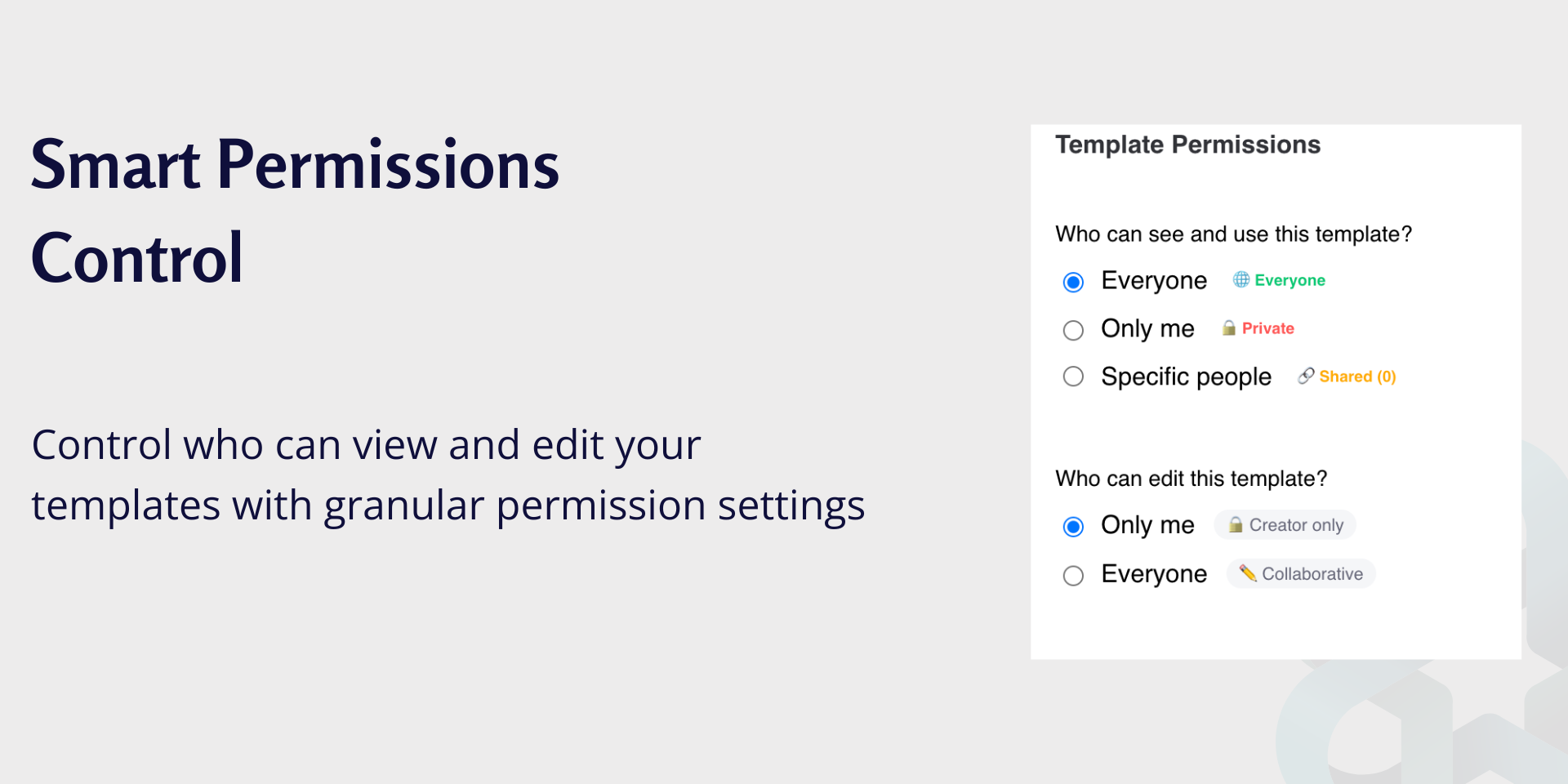 Advanced template sharing & permissions: Share templates with your entire team, keep them private, or share with specific people only. Control who can edit your templates while others can still use them.