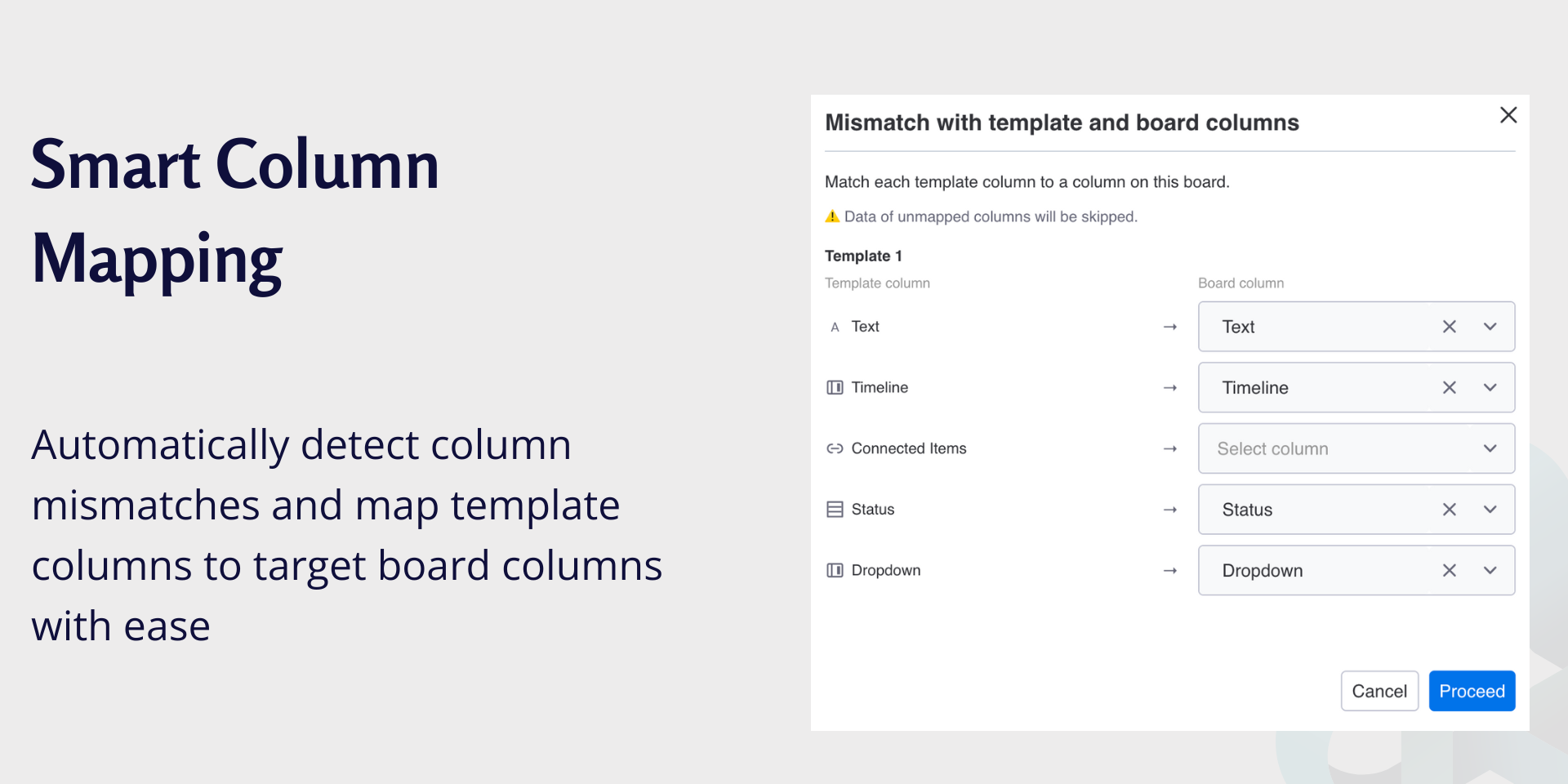 Smartcolumn handling: Automatically matches columns or guides you through mapping. Creates missing columns when needed.