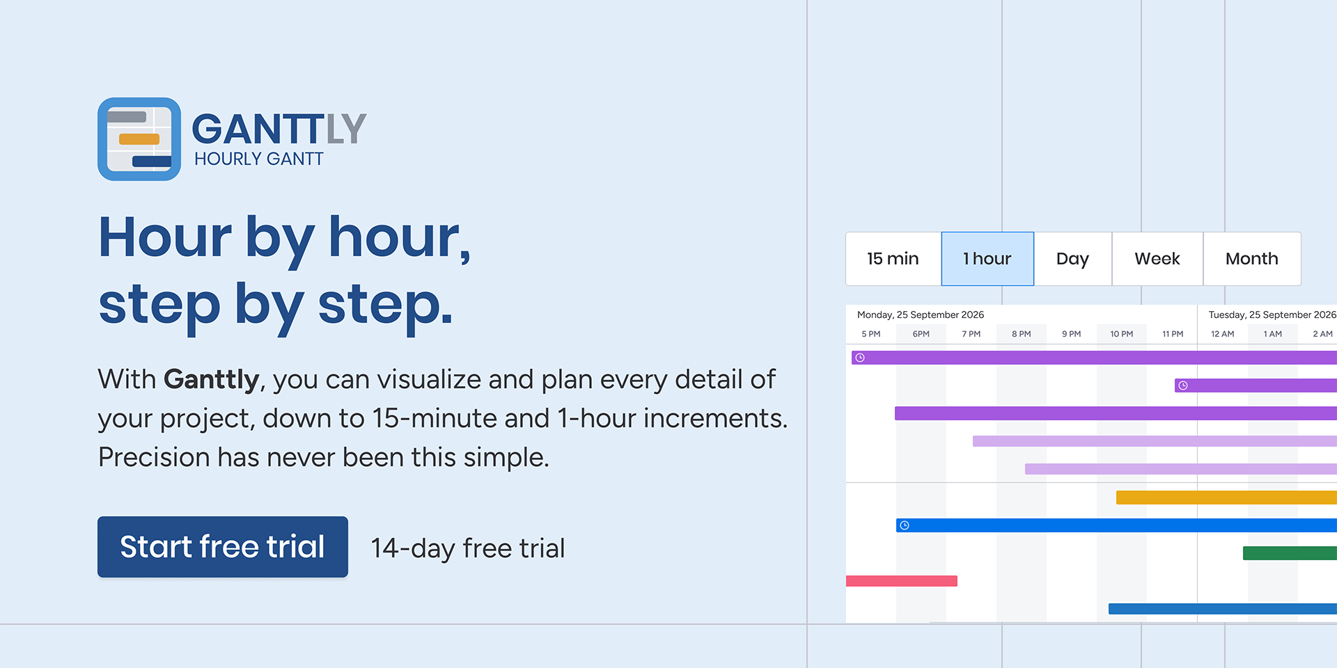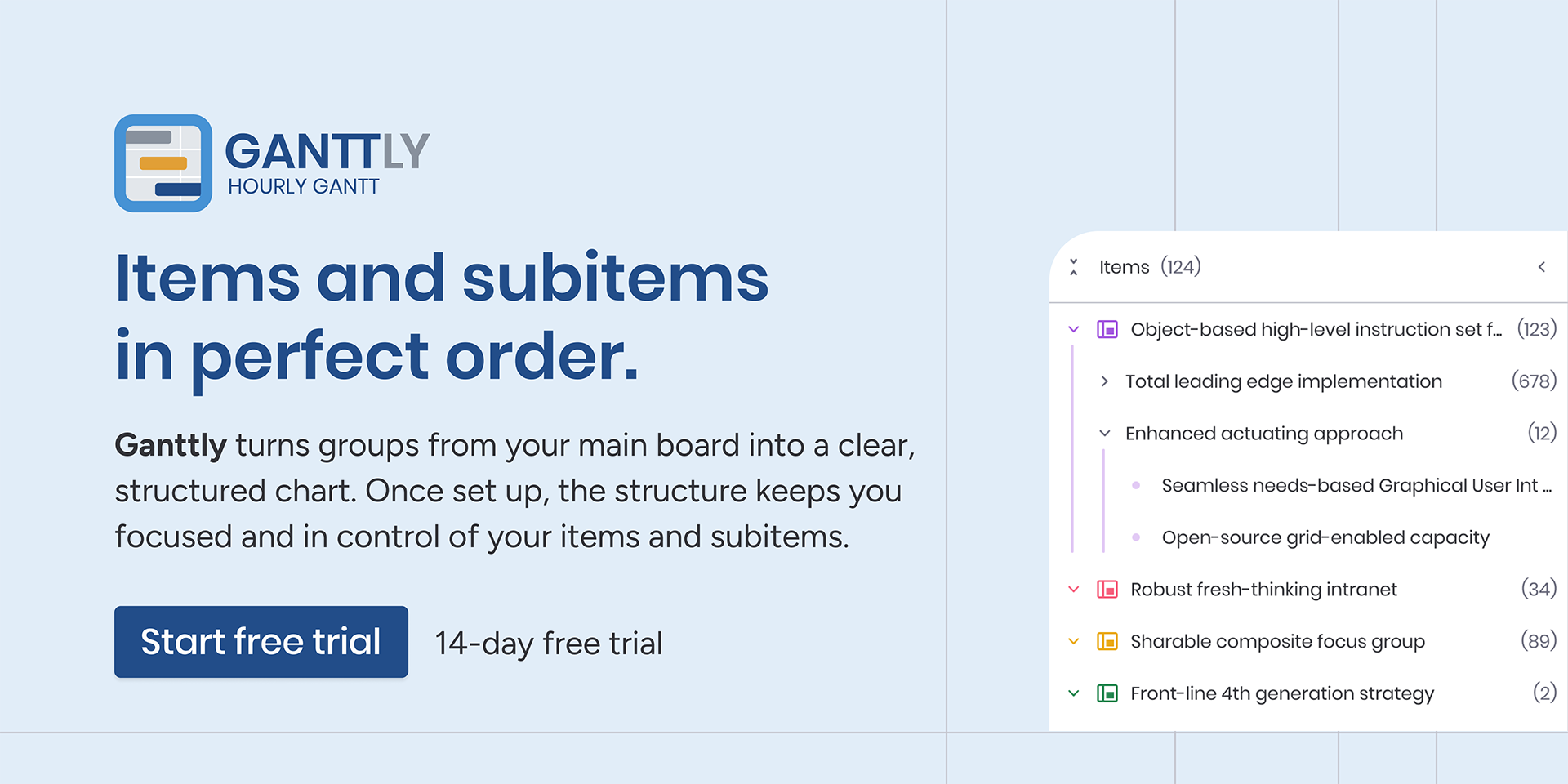 Take control of your projects with a clear, intuitive Gantt chart solution for monday.com. Ganttly helps you plan, track, and manage projects - from hourly scheduling to monthly overviews.