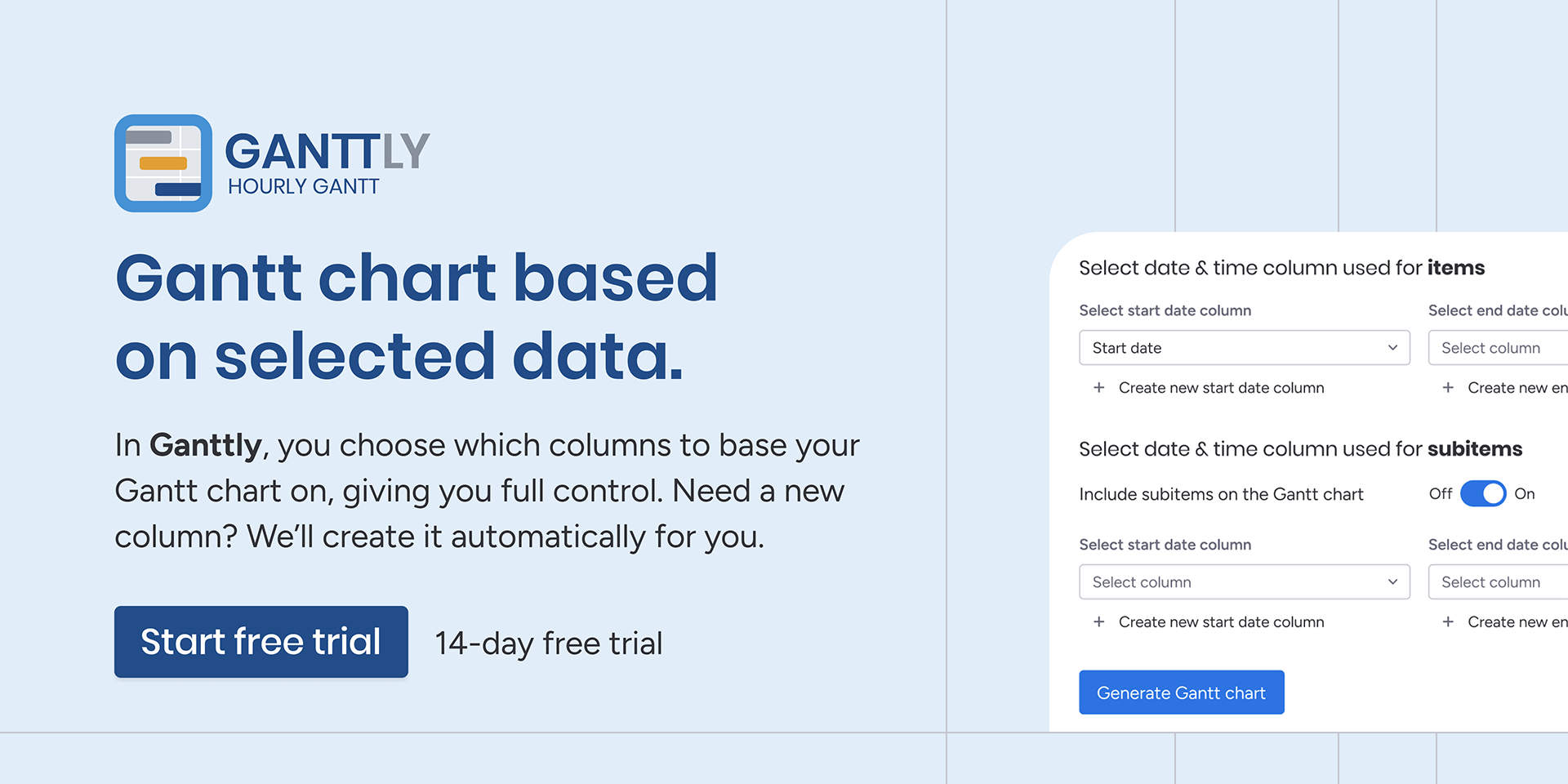 "description": "<p>Take control of your projects with a clear, intuitive Gantt chart solution for <a href=\"http://monday.com/\" rel=\"noopener noreferrer\" target=\"_blank\">monday.com</a>. Ganttly helps you plan, track, and manage projects - from <strong>hourly scheduling to monthly overviews</strong>.</p><p>Getting started takes just a few steps. Map your board’s start and end date columns (or create new ones instantly), and your timeline is ready. Both items and subitems are fully supported, so you can capture every detail without extra steps.</p><p>Once set up, the Gantt view gives you the flexibility to manage projects the way you need - functional and user-friendly, it was built for smooth navigation:</p><ul><li>Switch between hourly, daily, weekly, and monthly views</li><li>Keep your board structure intact - items grouped, subitems neatly displayed under their parent items</li><li>Each item/subitem appears as a bar aligned with its timeline</li></ul><p>No clutter. No complex configuration. Just a straightforward, reliable Gantt chart.</p><p>Ganttly gives you a timeline that feels natural inside <a href=\"http://monday.com/\" rel=\"noopener noreferrer\" target=\"_blank\">monday.com</a> - precise, intuitive, and effortless.</p><p>Take control of your projects with a clear, intuitive Gantt chart solution for <a href=\"http://monday.com/\" rel=\"noopener noreferrer\" target=\"_blank\">monday.com</a>. Ganttly helps you plan, track, and manage projects - from <strong>hourly scheduling to monthly overviews</strong>.</p><p>Getting started takes just a few steps. Map your board’s start and end date columns (or create new ones instantly), and your timeline is ready. Both items and subitems are fully supported, so you can capture every detail without extra steps.</p><p>Once set up, the Gantt view gives you the flexibility to manage projects the way you need - functional and user-friendly, it was built for smooth navigation:</p><ul><li>Switch between hourly, daily, weekly, and monthly views</li><li>Keep your board structure intact - items grouped, subitems neatly displayed under their parent items</li><li>Each item/subitem appears as a bar aligned with its timeline</li></ul><p>No clutter. No complex configuration. Just a straightforward, reliable Gantt chart.</p><p>Ganttly gives you a timeline that feels natural inside <a href=\"http://monday.com/\" rel=\"noopener noreferrer\" target=\"_blank\">monday.com</a> - precise, intuitive, and effortless.</p>",