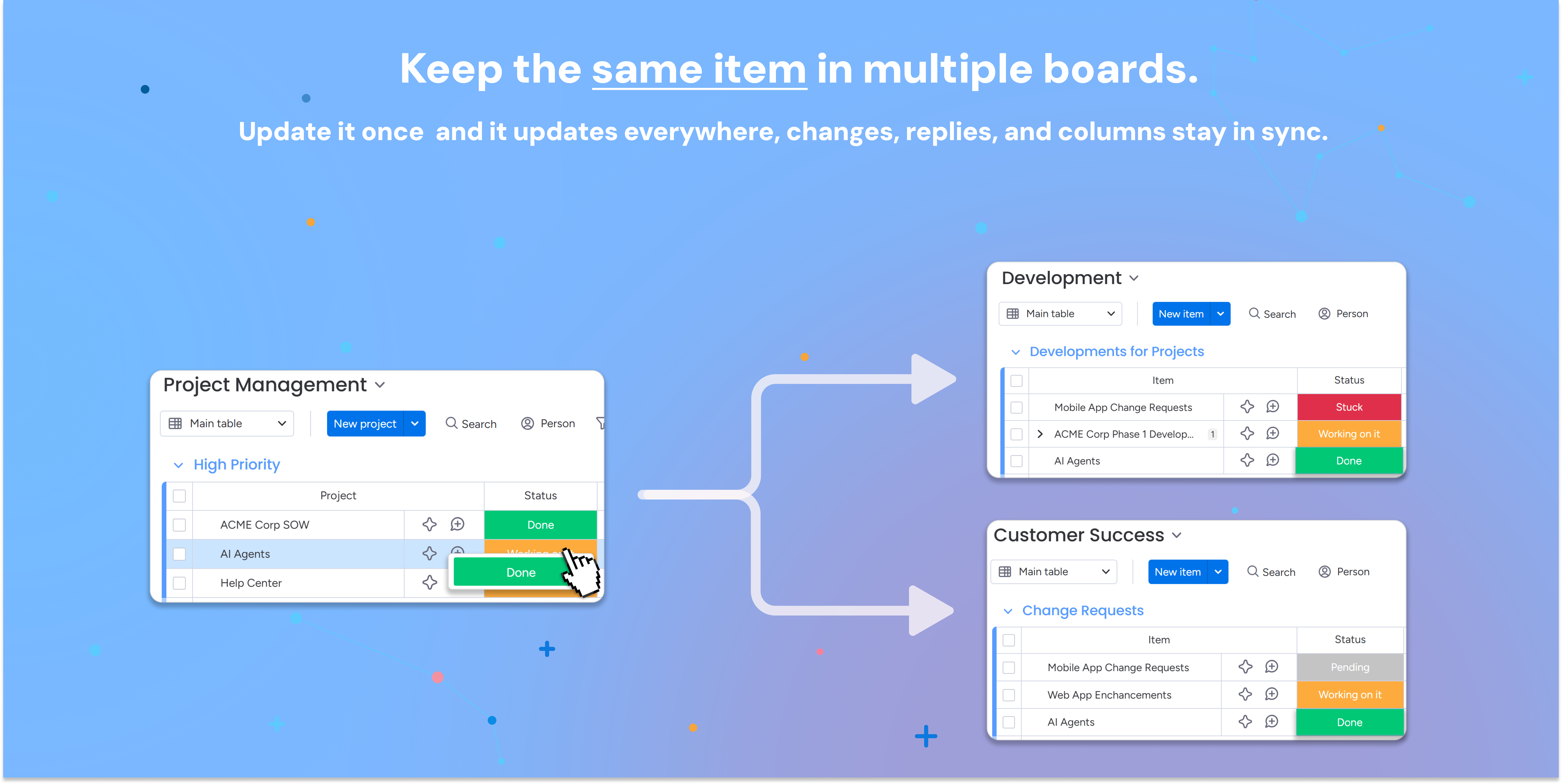 One item across boards. Without breaking workflows.