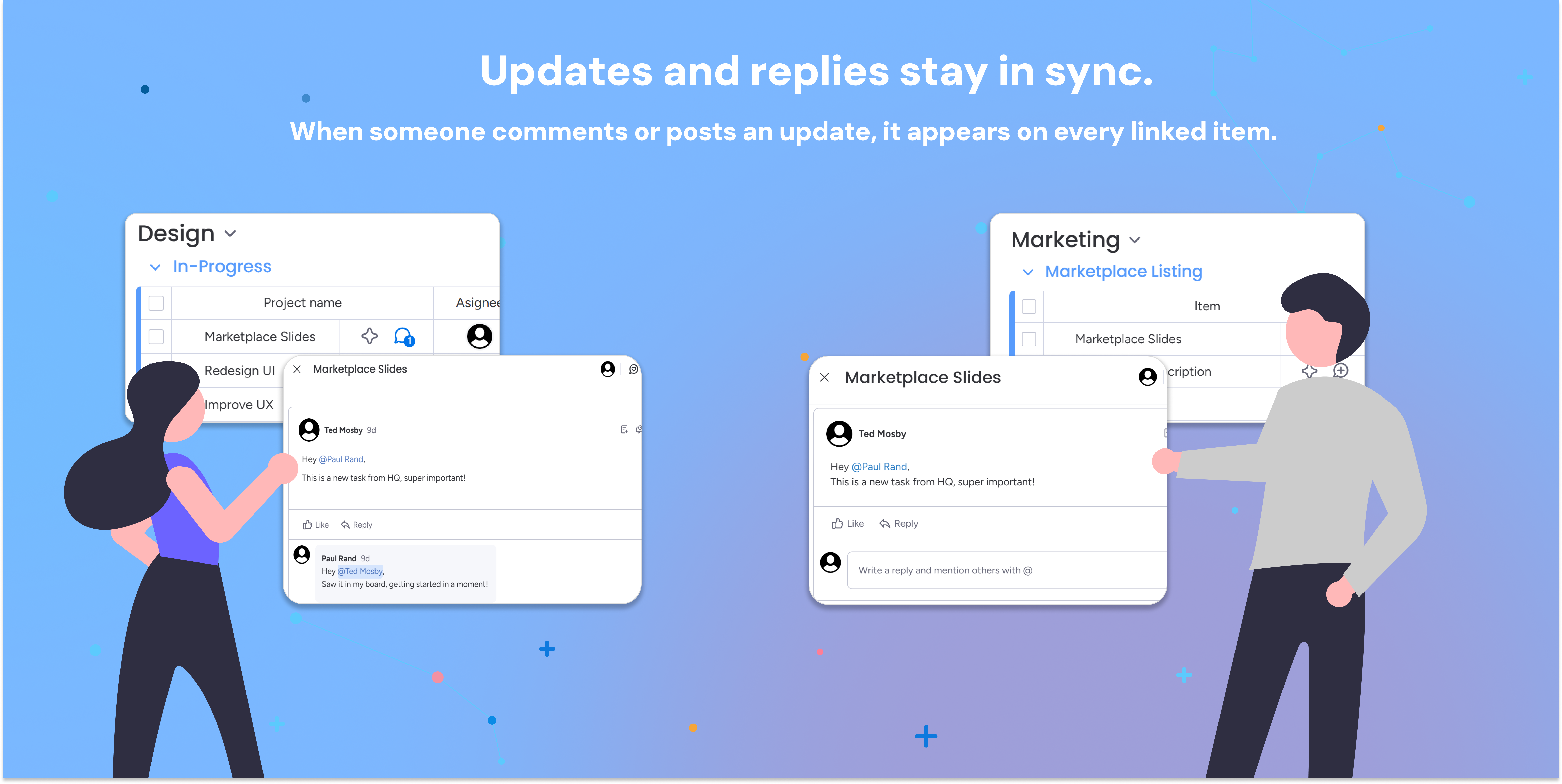 Sync item updates and comments across linked items so discussions, decisions, and progress stay connected, no matter which board your team is working in.