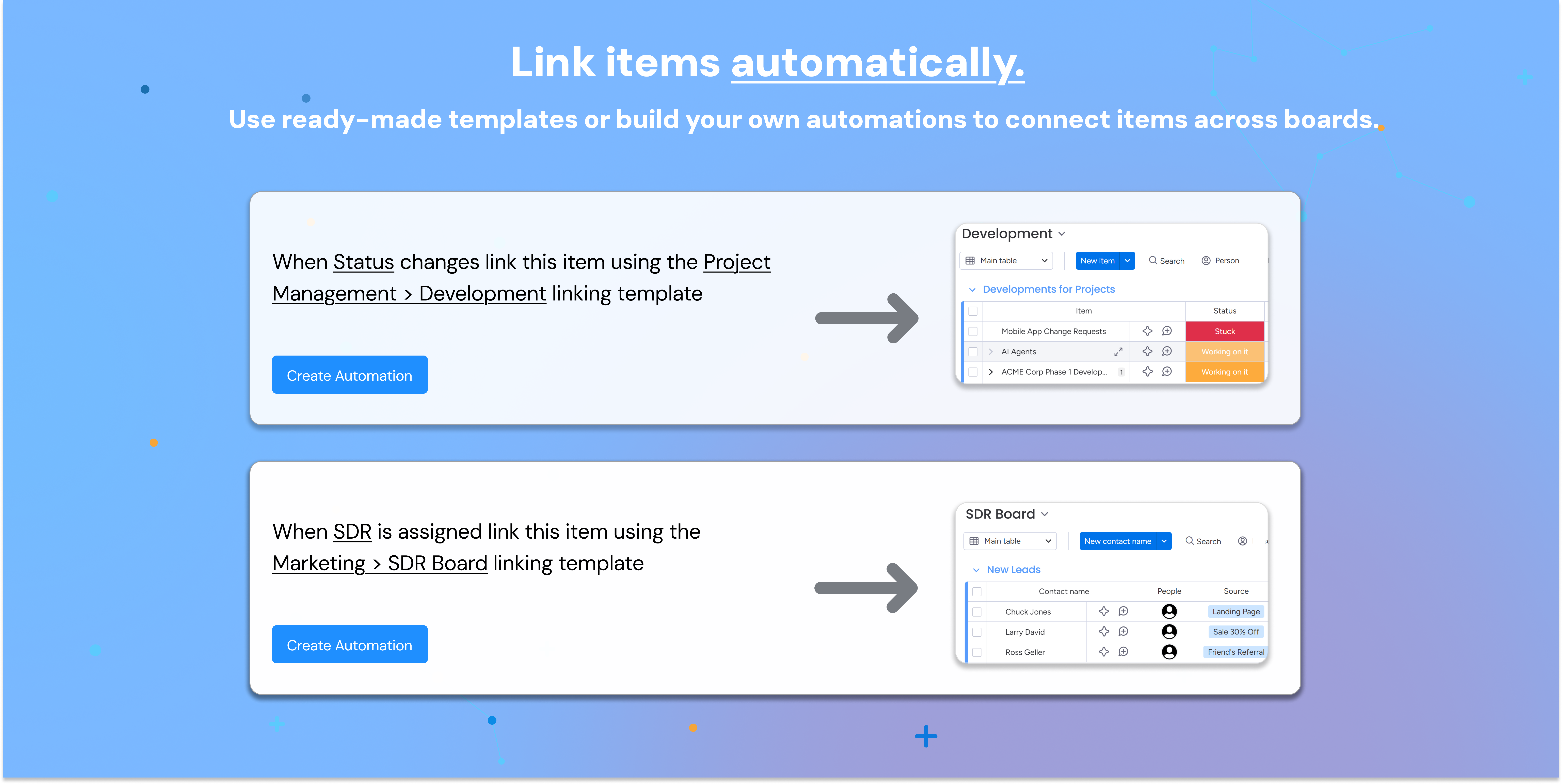 Automatically link items with custom automation recipes or ready-made templates. Decide exactly when and how items connect as your workflow runs.
