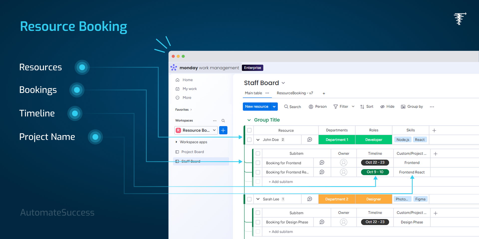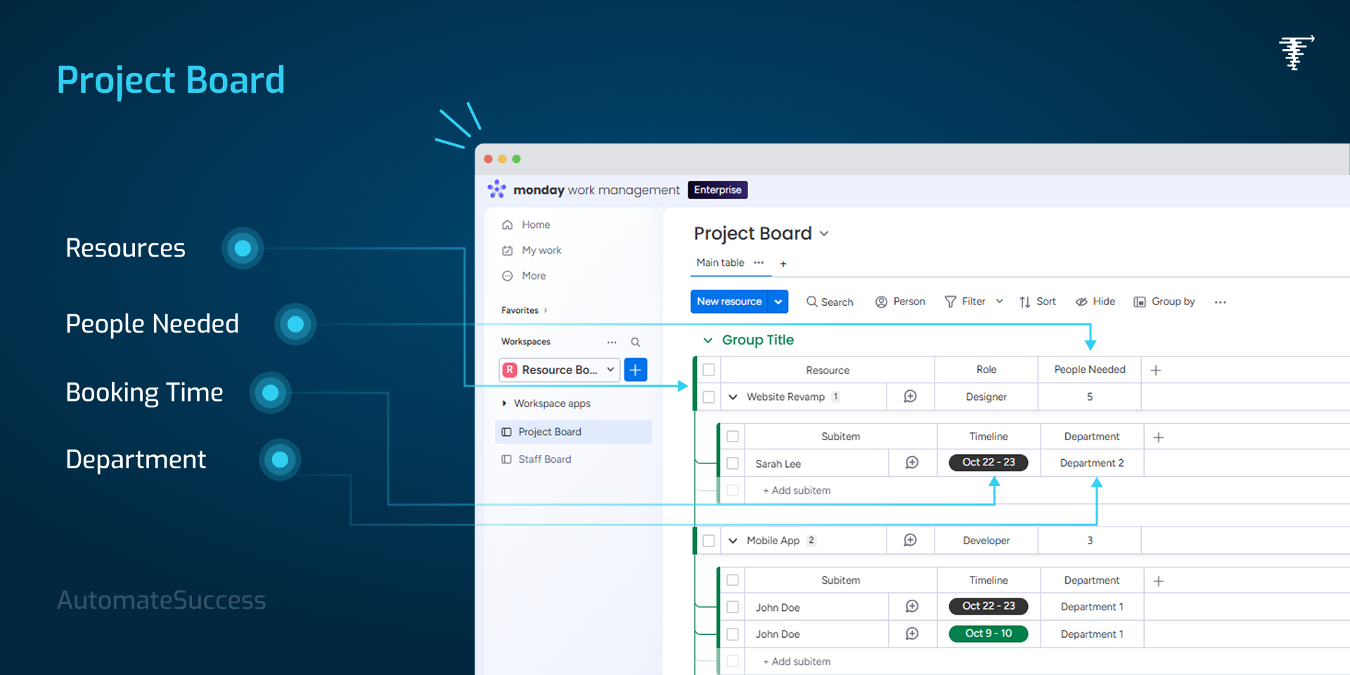 Booked resources are automatically added to project boards for full visibility and tracking