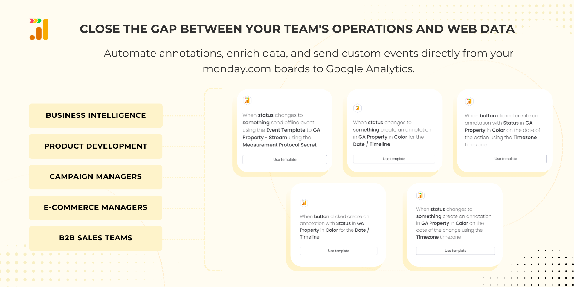With this app, monday.com board activity flows seamlessly into Google Analytics, giving teams a more complete view of performance and conversions.