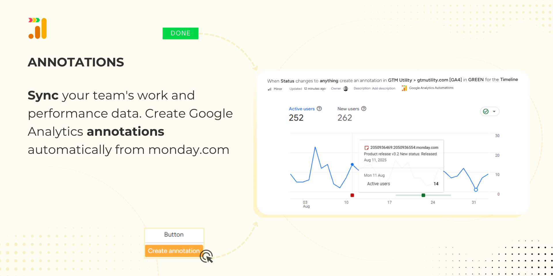 The Google Analytics Automations app connects your monday.com boards with Google Analytics, allowing you to send annotations and events automatically based on board activity. This integration makes your marketing, sales, and operations data more actionable by linking it to your reporting in GA.