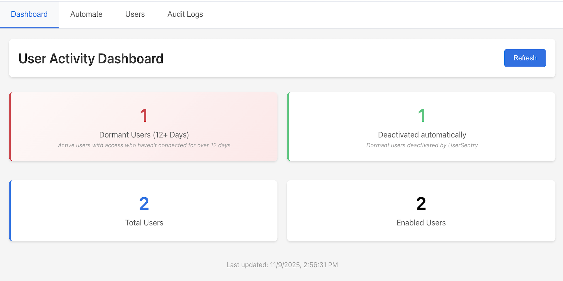 Dormant users often remain unnoticed, creating potential security and governance gaps. UserSentry gives admins full visibility into account activity, enabling them to detect inactivity, automate deactivations, and keep access clean and compliant.