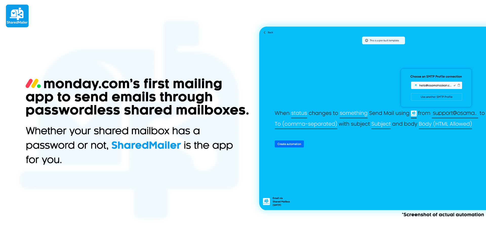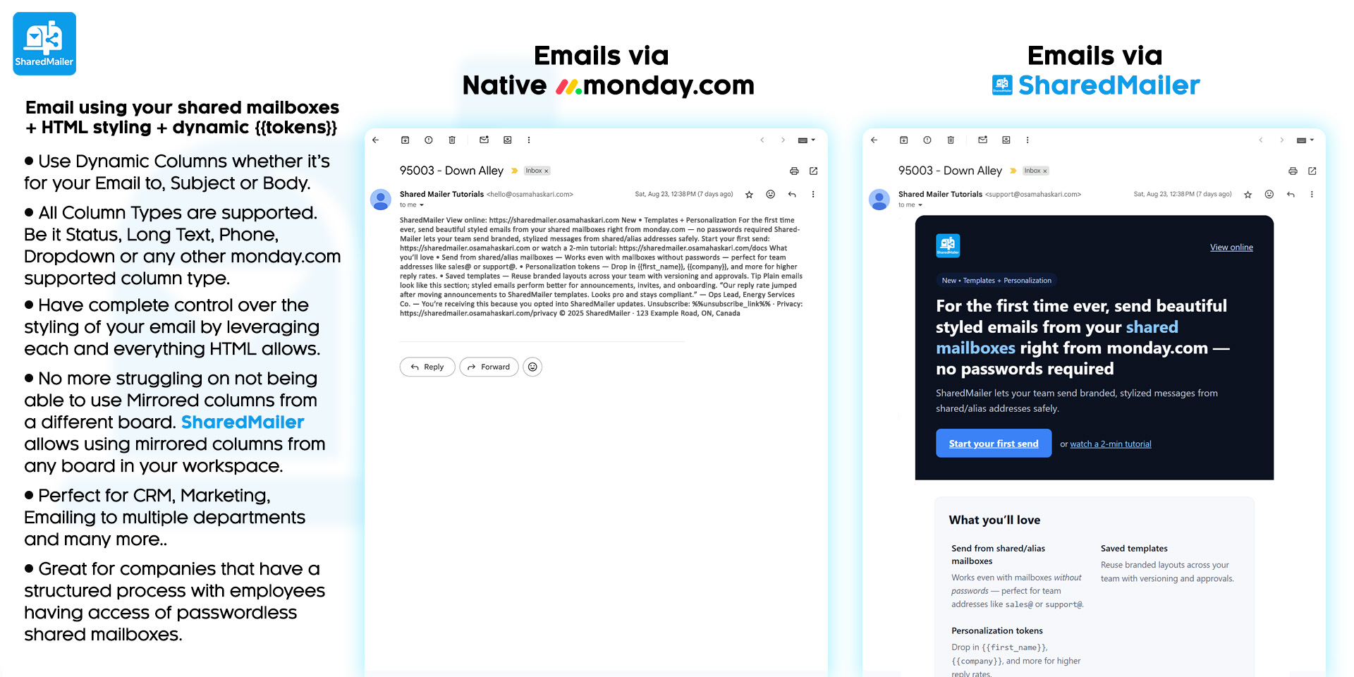 "description": "<p>SharedMailer brings professional, automated emailing to monday.com. Send from shared mailboxes, personal, or primary accounts - including passwordless shared mailboxes - so beautifully styled (or plain) replies are sent from the correct mailboxes. Built for teams needing branded, reliable communication at scale.</p><p>What you’ll get</p><p>• Send from SharedMailboxes - with or without a password - plus personal and primary accounts. No limits on mailbox type<strong>.</strong></p><p>• Use any HTML<strong> </strong>composer - do rich HTML/CSS styling for professional emails: responsive layouts, images, tables, custom fonts, polished signatures.</p><p>• Dynamic Column Mapping - personalize subjects/bodies with {{tokens}} from board columns.</p><p>• All Column Types Supported - works with Mirror and Connect boards.</p><p>• Dynamic Recipients - build the “To” address from Email/People/Mirrored columns.</p><p>• Pre-built & Custom Recipes - one-click status-triggered recipe or the atomic <strong>Send Email</strong> action block with any monday.com trigger.</p><p>• Bulk Sending - Hard limit of 100 emails per 5-minute window per account.</p><p>• Secure by Design - credentials live in monday.com’s native credential manager; nothing is stored outside your account.</p><p>• Works with Your Stack - Microsoft 365, Gmail/Google Workspace, and SMTP.</p><p>Problems we solve</p><p>• Passwordless shared mailboxes: send as mailbox via your account’s delegated access - no thinking “How do I login to an email account without a password?” No direct login needed. Just use your account with mailbox access and you’re ready to go!</p><p>• Use any email account that supports SMTP (shared, personal, primary). No limits.</p><p>• Eliminate manual copy-paste: all column types (including mirrored) pull live board data automatically.</p><p>• Need complex automation? Our action block allows you to send emails from any<strong> </strong>custom monday.com automation you already have - let SharedMailer bring your flows to life.</p><p>• No more boring plain-text emails - send fully styled, brand-consistent HTML Emails.</p><p>Typical use cases</p><p>• Customer support<strong>:</strong> auto-send email when status changes to “Resolved.”</p><p>• Project updates<strong>:</strong> weekly rollups or policy notices or onboarding emails using mirrored data.</p><p>• Transactional/Update Emails<strong>:</strong> send emails to users with their specific information fetched from columns including mirrored columns.</p><p> <a href=\"https://calendly.com/syedosamaaskari/shared-mailer-demo-call\" rel=\"noopener noreferrer\" target=\"_blank\"><strong>Book a demo</strong></a> or contact us.</p>",